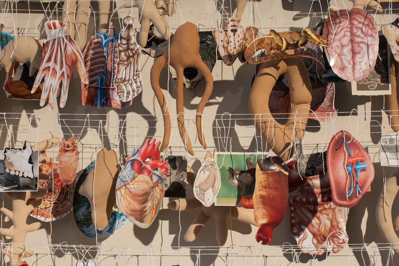 Complementing the installation is a newly created spatial collage made from cut-outs of various educational books. As in the main installation, Kot’átková explores the forces that constrain and discipline bodies. Yet in this surreal assemblage, fragmented and vulnerable figures come together as a collective body – one that defies categorisation into binaries such as weak vs. strong or sentient vs. non-sentient.