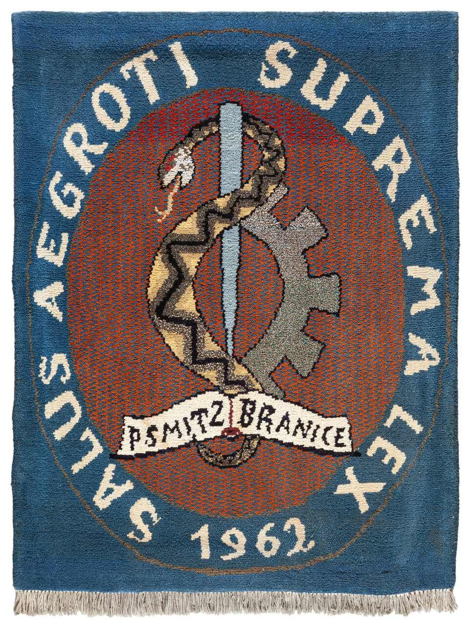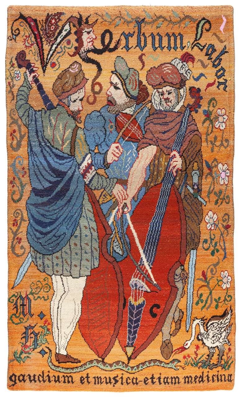 The second piece, also made to order by Henel, is also shown in this exhibition, represents a eulogy of non-pharmacological methods of psychiatric treatment, depicted as a group of three Renaissance musicians, with the inscription “Verbum, gaudium, labor et musica… etiam medicina” (word , joy, work and music… this is also medicine). The theme of this gobelin was imposed on Henel but its form, i.e. ornaments and colours, was chosen by the artist himself, and executed to perfection.