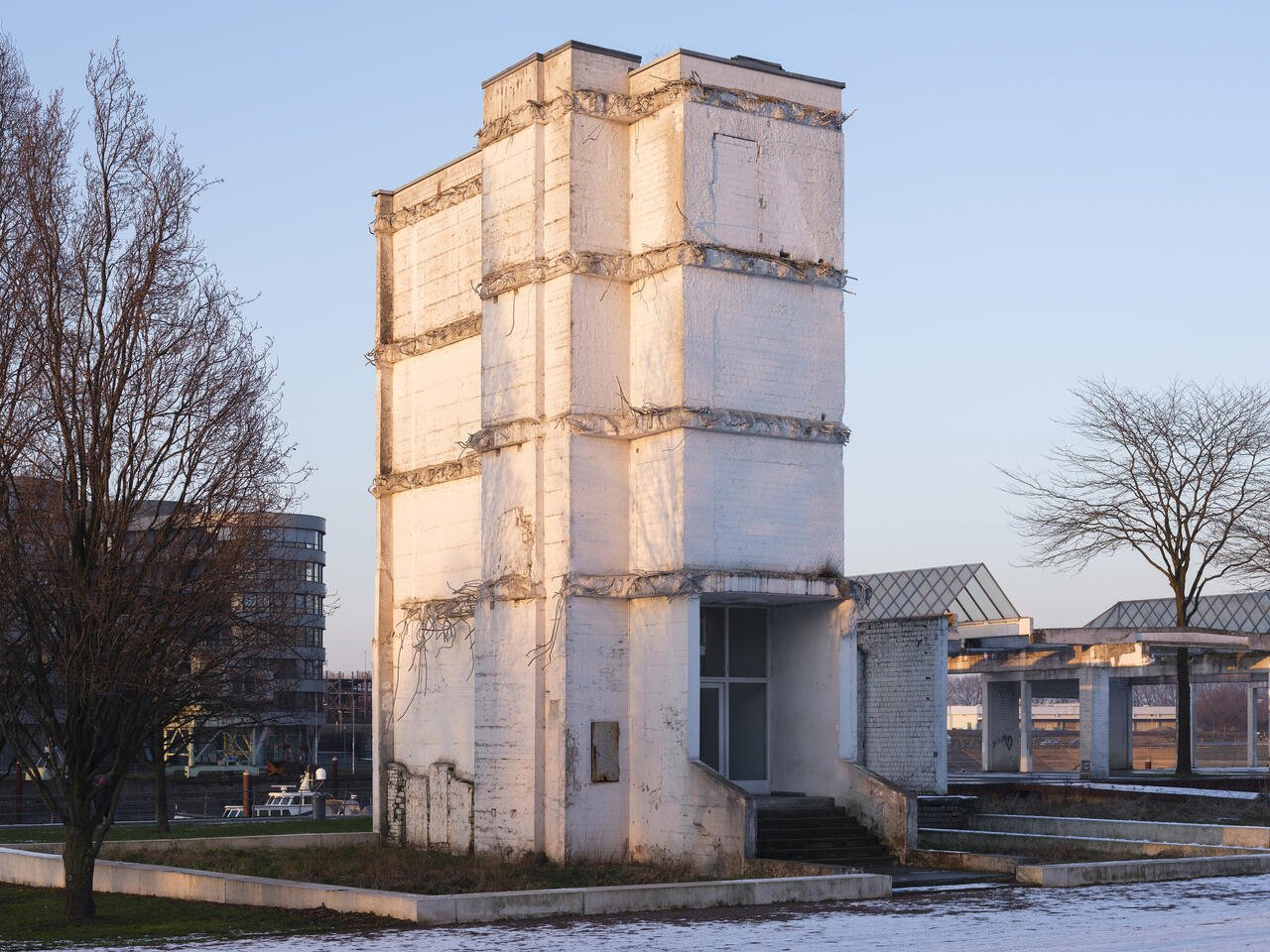 Image of the exhibition space “Ludwigsturm” (a permanent fixture of the Duisburg Inner Harbor), a prominent element in Dani Karavan’s “Garden of Memories”, 2025, Duisburg, photo: Heinrich Holtgreve. Image courtesy of Urbane Künste Ruhr.