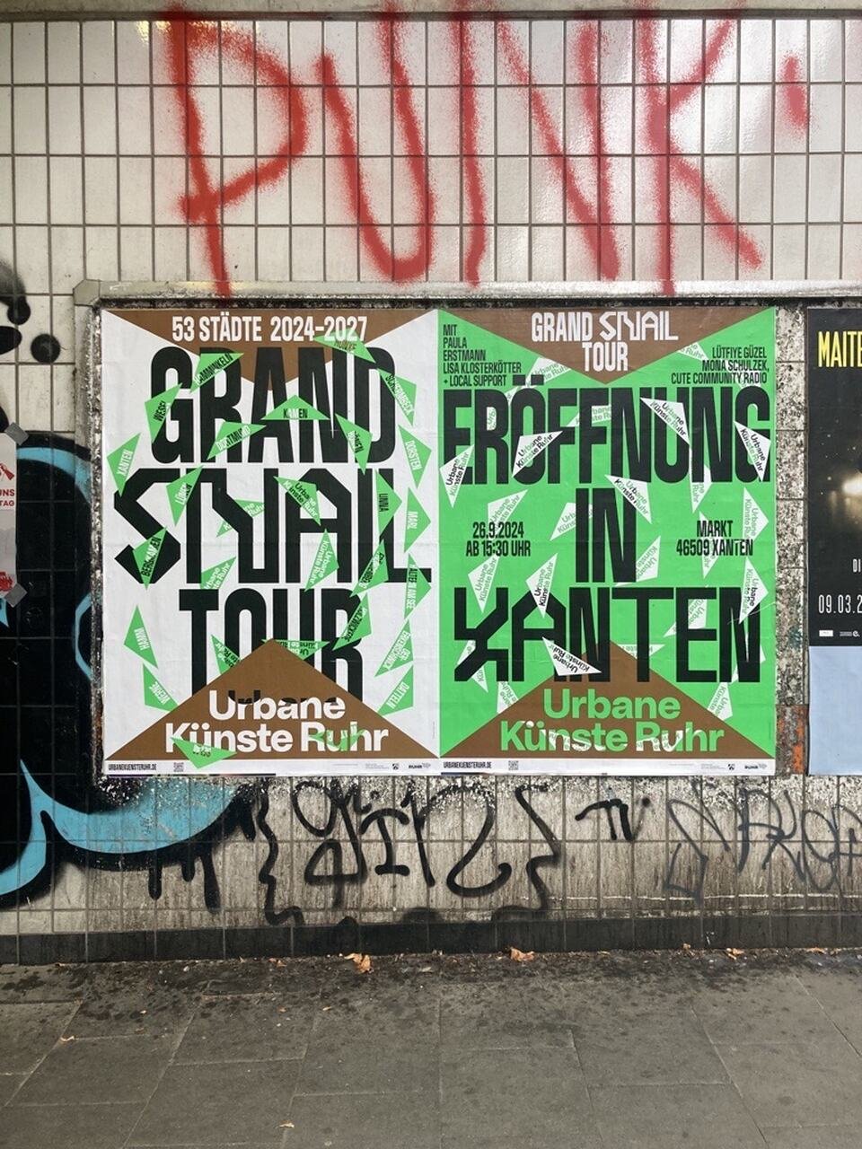 Posters for the opening of “Grand Snail Tour”, 09.2024, designed by Studio Yukiko, photo: Urbane Künste Ruhr. Image courtesy of Urbane Künste Ruhr.