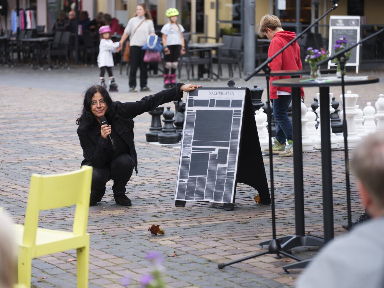 Lütfiye Güzel, “Local Blackouts” (poems derived from redacting local newspapers, the first of 53), 29.09.2024, “Grand Snail Tour”, Xanten, photo: Heinrich Holtgreve. Image courtesy of Urbane Künste Ruhr.
