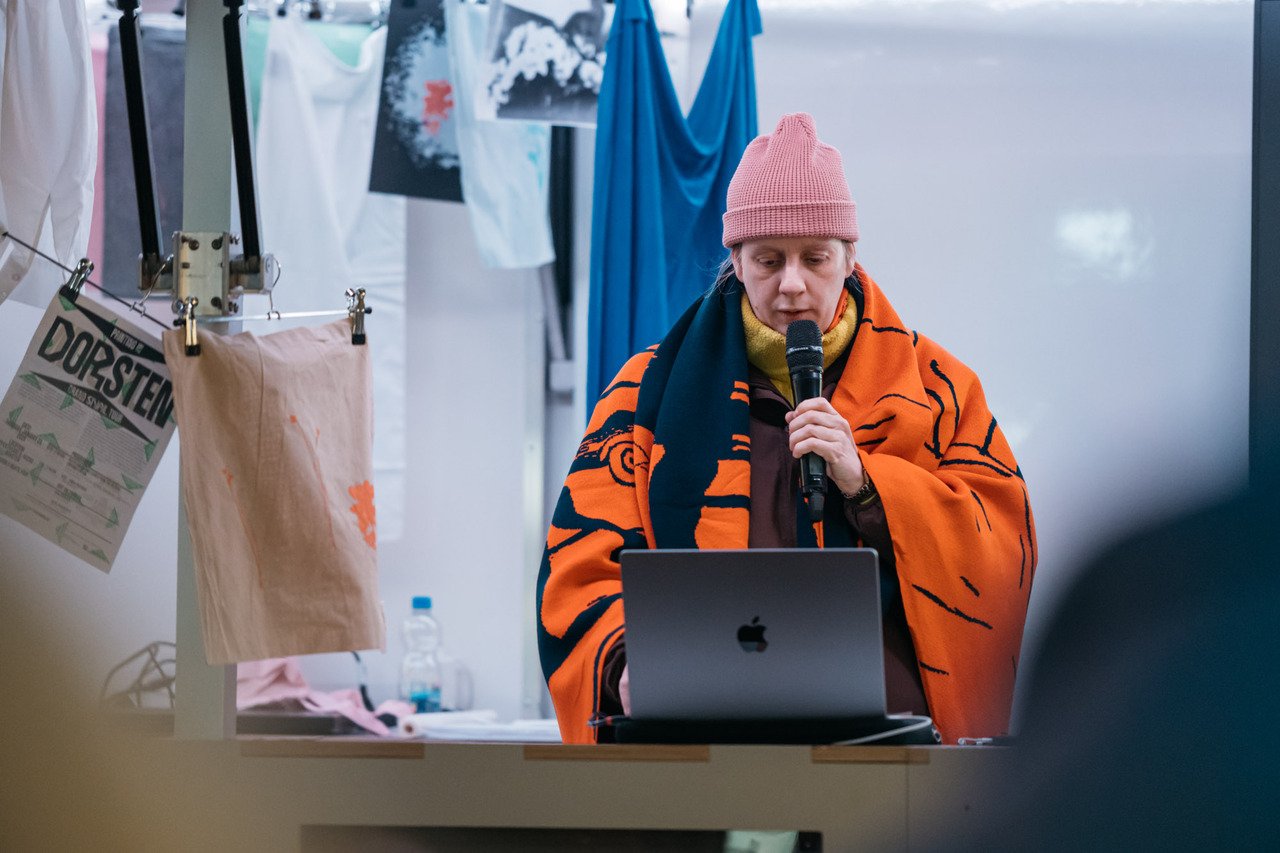 A reading by comic artist and illustrator Anna Haifisch who is enveloped in the blanket “Little Orange Snail” that she designed for “Printing in Dorsten”, 23.01.2025, “Grand Snail Tour”, Dorsten, photo: Daniel Sadrowski. Image courtesy of Urbane Künste Ruhr.