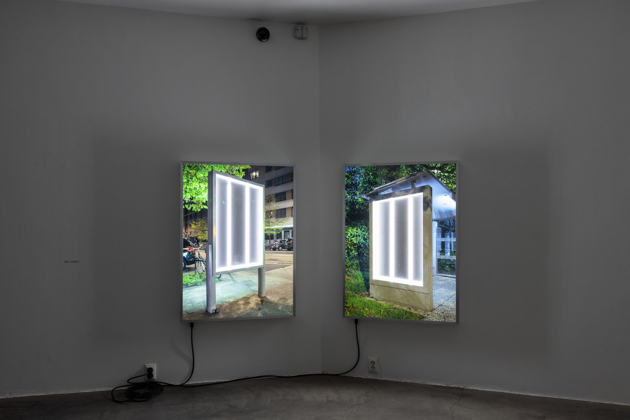 Untitled (2021), continues this inquiry through two lightboxes pierced with laser-cut openings, exposing their own internal mechanisms. The gesture of literally revealing what’s inside – both the machine and the medium – raises questions about our relationship to technology’s opacity: does exposure lead to understanding, or to new forms of anxiety? Instead of Bogush’ empty and trashy cardboard box, here the use of lightboxes, a format borrowed from advertising, turns the language of commercial display back on itself, implicating art’s own entanglement with visual consumption.