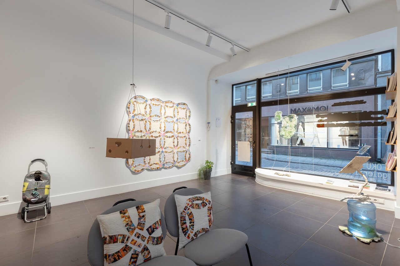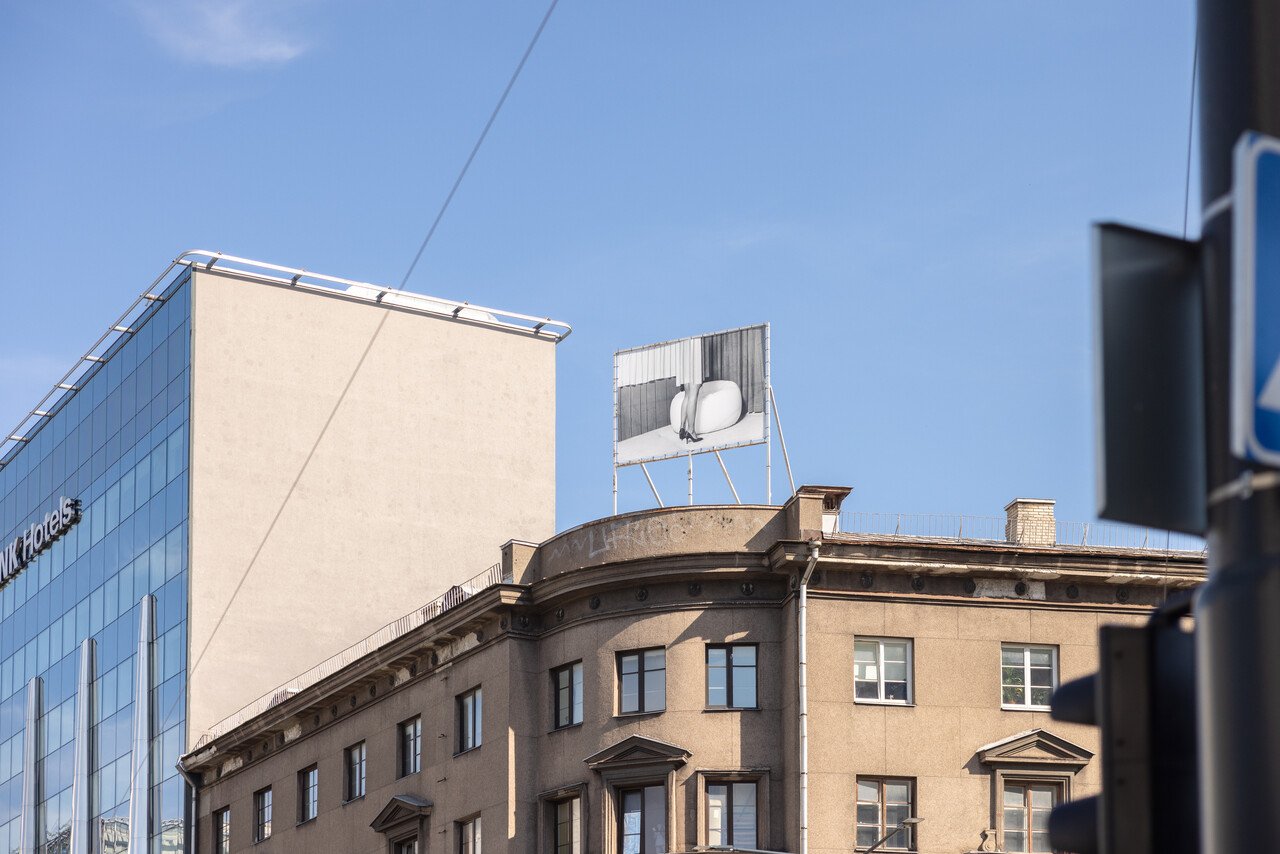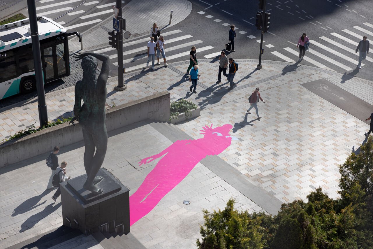 It is quite evident that Runge’s and Muravskaja’s exhibitions converse with each other on many levels, both regarding motifs and sentiments. On the other hand, the group exhibition echoes the public works, which I head back to the city center to check out before the sun sets. Curated by Kati Ots and Trine Stephensen, the show Shaping the Unclaimed intervenes in a highly commercial intersection among shopping centers and a construction ground where the former art academy once was. Now it will be rebuilt into (expensive) housing. Six artists intervene in this space, setting the stage for softer, more intimate and humorous interactions. The most immediately accessible work is Mare Tralle’s I see you! (2025), an installation interacting directly with the public sculpture Hämarik (Dusk) placed right outside Viru Keskus Department Store. The sculpture was installed by sculptor Mare Mikoff in 2005, mimicking a classical nude statue. However, the combination of the commercial setting (some people call the shopping center “dawn”, thus connecting the two), the size (five meters), and the nudity, has been a difficult cocktail for some. Here, the statue gets its own camp, big-eyed, neon pink shadow by Tralle, further building on its myth. It is a clever move, and to me, represents what good public and site-specific art can do: interact with existing surroundings, induce curiosity in passers-by, and generate new contextualizations (here, addressing awareness for (or lack thereof) the safety of sex and gender minorities in public).