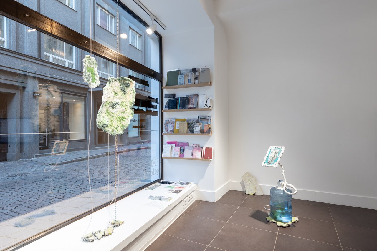 Kristina Öllek seems to be channeling some of the same second-hand aesthetics as Ketamo, but takes her point of departure from natural rather than urban materials. In her work, the geological and the biological merge: cyanobacteria, sea salt, limestone and bioplastic become photographic matter. In FOKU Gallery, Eutrophication, I See You (2024) and Loading Nutrients (2024), both from the series Converting Energy and Oxygen, examine the Baltic Sea as a living system – its toxic algal blooms, eutrophication, and shifting chemistry reflecting the wider ecological consequences of human activity.