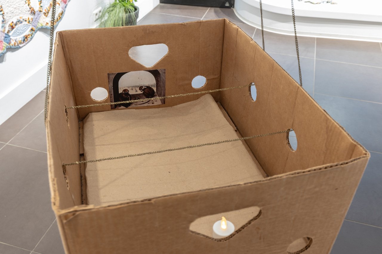 The first work I encounter is Andrey Bogush’ Rendering for 2 Monkeys Reading Love Letter to Barthes, in Box, with Light (After Brugel) (2025). It is a cardboard box hanging from the ceiling with round and triangular holes cut into it. Inside is a plastic candle and postcard stuck to one of the sides of the box. The postcard shows a painting of two monkeys, but it is not the famous one by Bruegel himself (Two Chained Monkeys, 1562). Bogush plays around with references of colonialism, materiality, and French Theory, but it’s done in a subtle and almost perfunctory fashion. As if to welcome the question “is that supposed to be photography?” head-on with an invitation inside a faux camera-obscura. This is an extreme example, but it points to the approach of the biennial as a whole: it thinks of photography as a mesh of questions, materialities, and societal issues.