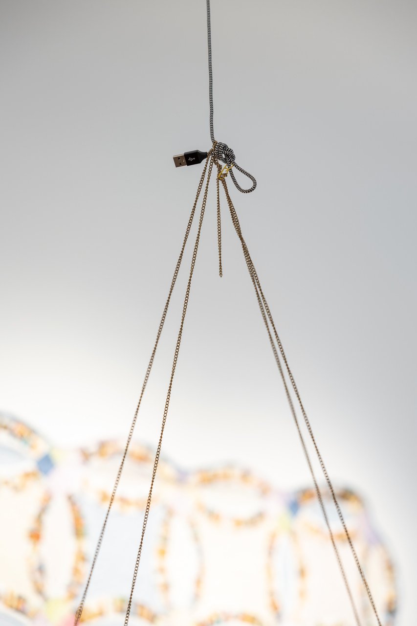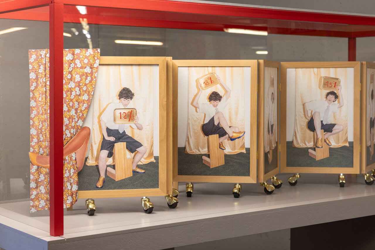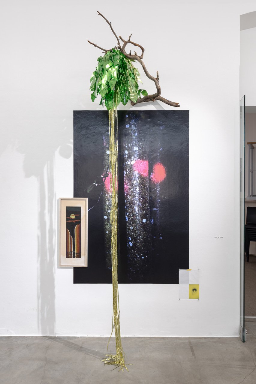 Karl Ketamo couldn’t be farther from Bogush in his practice, except maybe for the fact that they both seemingly have nothing to do with a traditional understanding of what photography is. Basing his works on found and recycled objects, his expression is colorful and quirky. Just behind Rendering for 2 Monkeys… stands Ketamo’s In No Time (2025), a found gasoline canister with other small trashy objects like stickers and rubber attached to it. It is all play and surface it seems, a plunge into the random – and wholesome – beauty of restricting oneself to working only with second-hand materials.