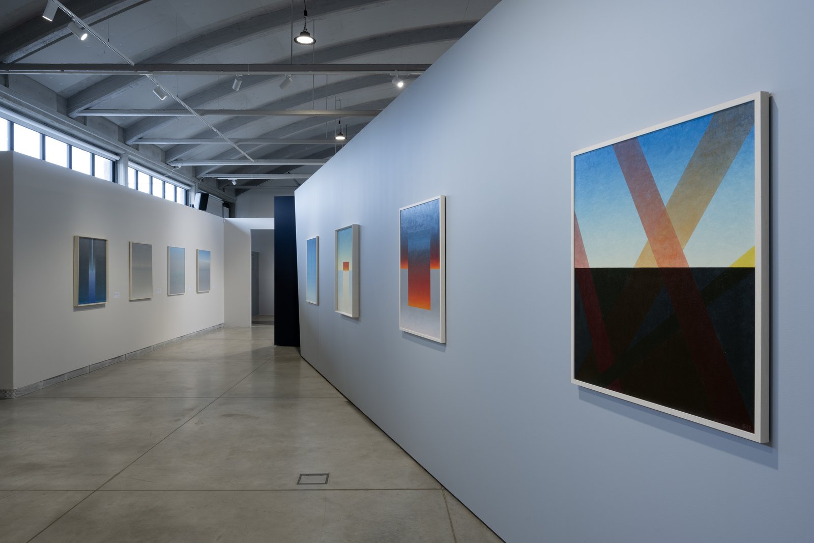 Runge has an excellent intuition for color gradings and for illustrating how different nuances glide into one another on the canvas. Traversing her series on darkness, reflections in silver paint, combinations of two- and three-color gradings, the exhibition shows her deep commitment to the exploration of light and its relationship to color and mood. The hard sunshine from the overhead windows of Kai Art Center really helps set the atmosphere for Runge’s work and it is overall a pleasure to stroll around the space. Because of the natural lighting no angle hits quite the same, and the different perspectives of the viewer combined by the changing daylight makes it so that no experience of the works are the same, either – they change constantly with new reflections and abstract patterns emerging as time passes. One of the highlights is the series Landscape (1981-1994) which combines Runge’s love for light reflections with different moods of the Estonian landscape – both melancholic, peaceful, forceful, and tense.