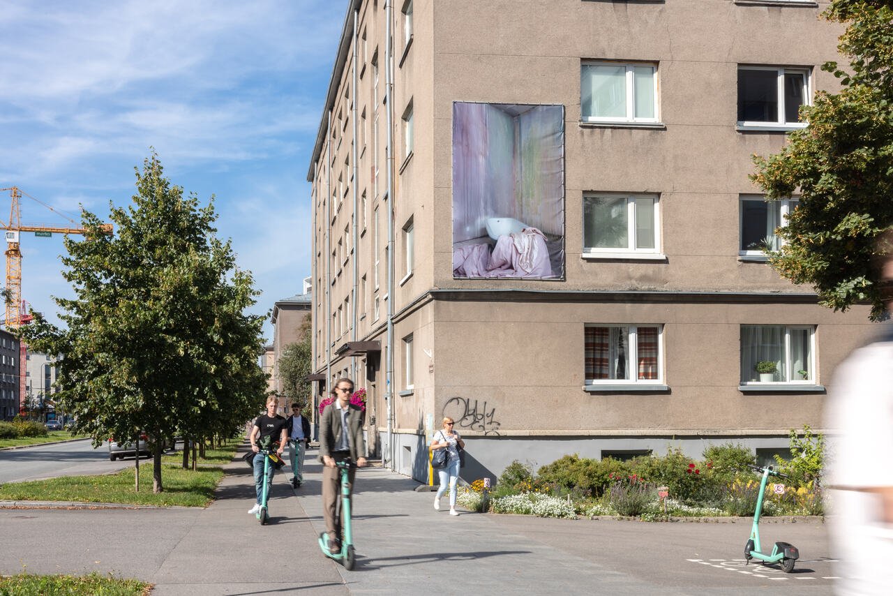 Other works are less visible: Eva Stenram’s coquettish pin-up girls derived from their nude parts hide away on top of buildings blending into the urban backdrop and thus opposing Tralle’s approach. Mia Dudek’s liquidy large-scale photo of a private bathtub – the velvety textiles emerging from it paralleling the pastel discolorations on the walls – is hidden on an anonymous wall a bit further out of the center. Both artists present their work as something that you would stumble upon on your way from one thing to another, which bears a quality in and of itself, a quality of quotidian awareness in a stressful urban life. This could also be said of Elo Vahtrik’s The Bold and the Beautiful (2025), which has subtly exchanged a normal textile-fence around the construction site of the former art academy with a textile fence printed with colorful, kitsch photos. Or Sigrid Viir, who has decorated an underground pedestrian tunnel with 1950s-inspired domestic interior including colorful, flower-patterned curtains interspersed with photos of the artist quirkily puncturing the domestic idyll.