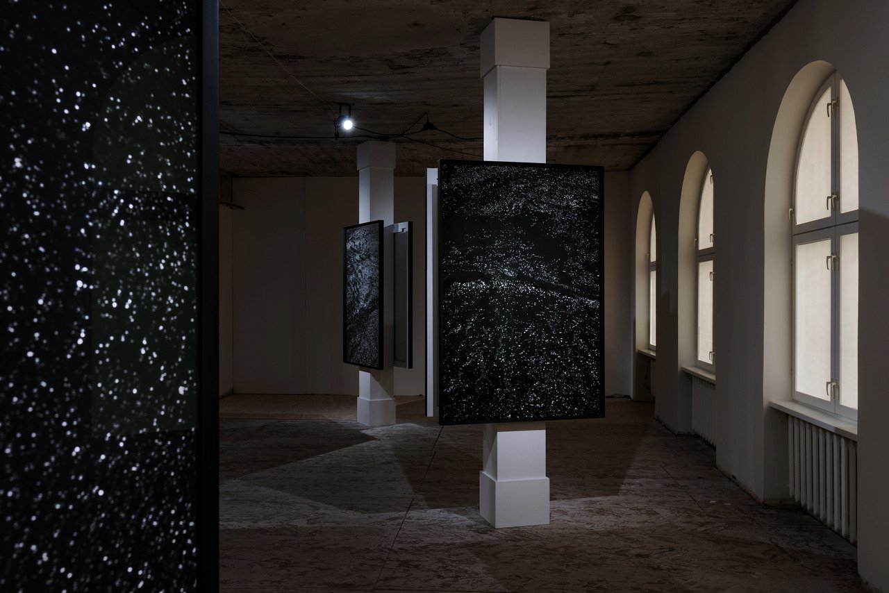 Apart from the group exhibition, two major solo exhibitions and a selection of site-specific urban interventions make up the main program of the biennial. Tanja Muravskaja has a long career behind her as a photographer focusing on societal and political issues in Estonia and beyond. Therefore, it is an interesting and welcome change to see her highly materialist and poetic unfoldings in Gardens: Tanja Muravskaja and Light installed in Saarinen House, a stone’s throw from FOKU Gallery. In the Gardens project, Muravskaja has dived deep into feelings of home and safety connected to the sea and its reflections and distortions through the photographic medium. All 14 works share the same big size (165×110 m) and almost the same abstract motif – a dark background with what seems like thousands of small blinking lights – or stars? It could literally be a satellite view of a big city on Earth or a starry sky on a clear night. But actually, it is close-up photos of the sea taken from Muravskaja’s childhood home Pärnu, altered so that the light is almost sucked out of them and only the reflections from the sun are visible.