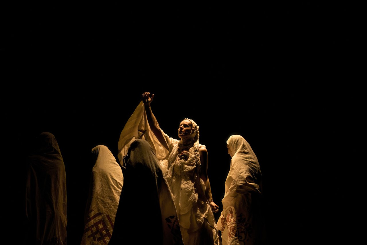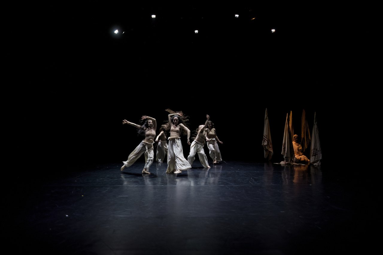 The opening night of the festival continued with the dance performance Cossachka by Juliia Lopata and Gala Pekha. Inspired by the Amazons in ancient Greek mythology – female warriors who are said to have lived from the 6th-2nd centuries BC in the Ukrainian steppe – the work dealt with the collective identity of women, the definitions that are attributed to bodies, and the feelings that nest in them within this context. The performance began with the singing of one dancer who seemed to embody a sort of mother figure, and her unwrapping of the other dancers from textile cocoons. The slow beginning transformed into a pulsating choreography. The dancers were impressive – their movements rhythmic and in sync, their bodies bent together reaching an invisible limit and then a little beyond it, only to start again in the next moment, fully focused already in another place. The harmony was almost militaristic at times, the collectivity serious and unambiguous. The militance was set against the recurring motif of long hair (at one point the dancers moved in a circle and braided each other’s hair), long white sheets, a plaintive and hypnotic song in the beginning and a slow end, hatching from the linen cocoon and finally returning to it, a murmuring shadow. The work felt ritualistic. And although the choreography was physically demanding and powerful, what I read most into it was spiritual resistance.