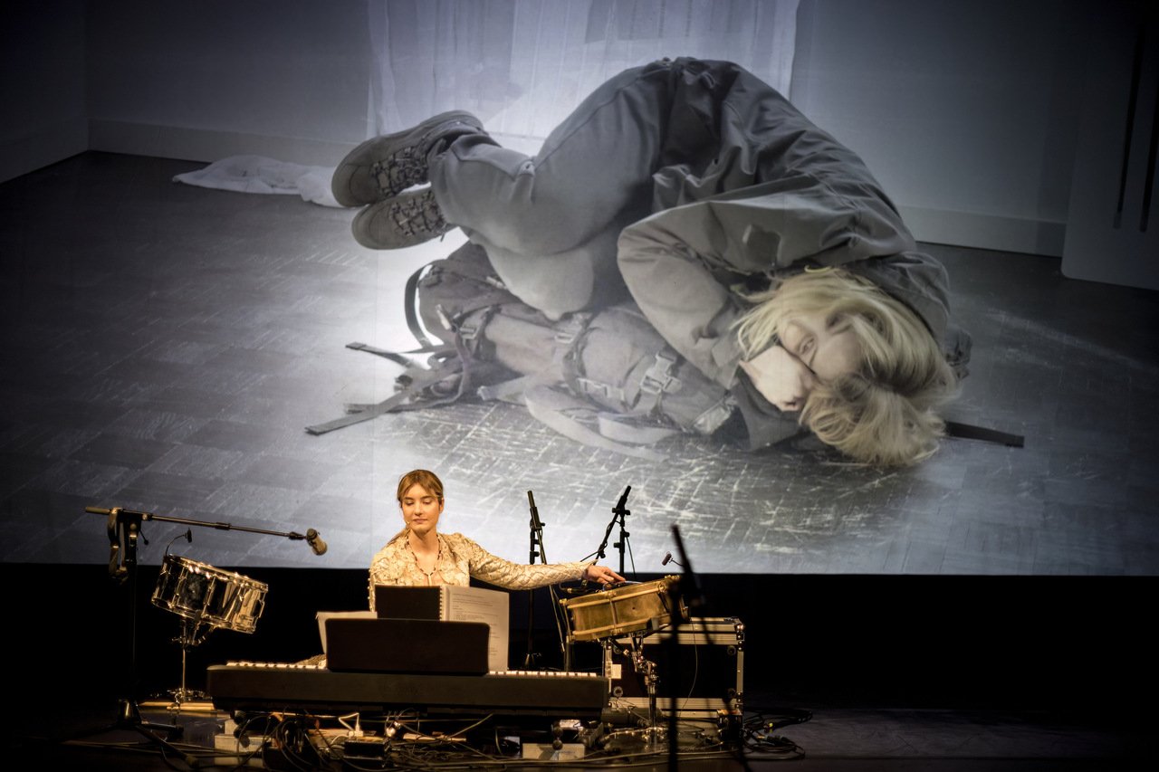 The festival opened with Magda Szpecht’s performance She stands in the middle of a battlefield, which follows the artist’s friend, a woman who decided to join the Ukrainian army in 2022. Through voice messages sent to her friends, the work reconstructs her thought processes, preparations, and everyday life during the war, and this sudden and total life change. The performance is scene-based. In a satirical manner that mimics content creators’ product presentations, the performer introduces a dry shower useful in spartan conditions, followed by a musical imitation of an anxious phone call, a monologue in the patriarchal language register of the military, the flying of a drone, and a training video in wastelands and unfinished construction sites. The performer, Agata Różycka, works alone on stage and in addition to everything else, changes batteries in radio transmitters and adjusts microphones, which is why what happens on stage is sometimes awkward and drawn-out. But the anguish that remains crippled by the fragmentary nature of the work is convincing – the reality of war cannot be summarized in complete scenes, tempered with harmonious compositions. In the discussion group after the performance, the author noted how important it was for her to put her friend’s experiences above all into sound; to make audible the voice of someone who is in an impossibly difficult situation, and whose decision to place herself (and her body) there was completely her own. I think about how many times women’s will, anger, and fear are mediated, and how here, it has reached me through several devices, wavelengths, and someone else’s body. How, comfortably dangling my feet while sitting in a black box theater, I can sense the sounds and shades of her microcosm, but never their full scope or sharpness.