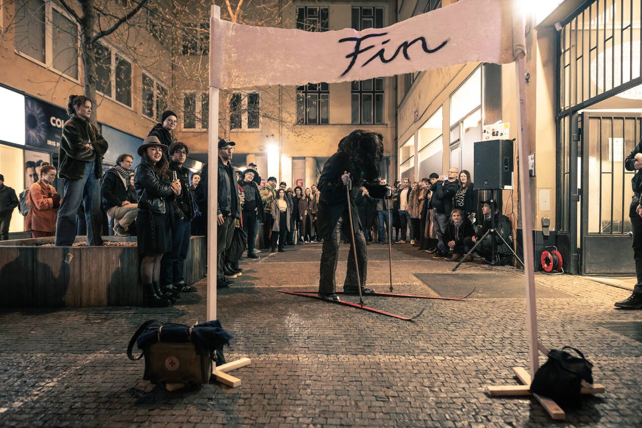On Monday evening I headed to Divadlox10 to watch Pasi Mäkelä’s performance Fugk, which began outside. People smoked and chatted until a man on skis, wearing a bear’s head and a fur coat, emerged from the building. He made circles on the asphalt, dragged himself onto the main street and stared at tourists. At the same time, distorted sounds came from the speakers, which, I learned the next day in the workshop, were different Finnish words for bear, of which there are about two hundred in total. After about ten minutes, we were allowed into the hall.