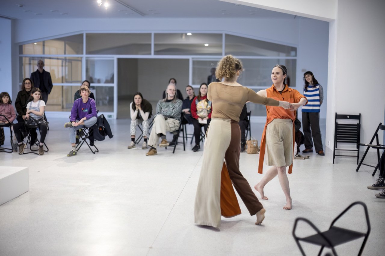 Ha-ha-ha-ha-ha-ha-ha, two women laughed on the podium, holding each other. The doors of the fifth floor of the National Gallery were unlocked and festival visitors were let into an empty, white, artless space. Dana Chmielewska and Monika Szpunar filled the air with rhythmic laughter while simultaneously assuming the physical stances of stone sculptures from art history – works created by female sculptors such as Camille Claudel (i.e. The Abandonment, 1905) or the lesser-known Tola Certowicz (i.e. Pokora, 1918) and Ewa Kulikowska. I felt the bodies wanting to escape the stone’s grip and come through the speaker’s lips. One of the choreographers of the piece, Weronika Pelczyńska, asked a question as the starting point for a performance in the workshop the next day: how can you remember the art history of your people in your own body? And, what becomes of your body in this case? The body can be an object to be carried around the room like a bronze sculpture, and with it, all the baggage – the marginal position of female artists in history, the even more marginal position of female sculptors in relation to painters, the requirement to be financially secure to even get into art school, etc. But the body can also be a means for the emergence of new meanings. Not for tearing down old ones, no, but for highlighting, moving them, playing with them. The area reserved for the dancers was bordered by four white pillars on which catalogues “Corset off. Camille Claudel and Polish Women Sculptors of the 19th Century” were placed for browsing during the performance. At one point, the audience became excited and began simultaneously looking up the sculptures embodied by the performers in the catalogues. Spontaneous unions were born – a man in a black suit held the pages of a book open while I followed the table of contents with my finger. Others across the room did the same. The audience’s agency was activated and a delicate network emerged in the room. After a while, I started to wonder if this is where the performance was heading; I waited for some kind of turn, a change. The performance finally culminated in liberation – the bodies danced as a means to express love, frustration, and why not also, history. “I would like to hug my friends now,” I thought to myself as I left the hall, or even more so to lie with them, to live on top of their backs, to touch them and to not break this contact. Pelczyńska emphasizes the creation of connections as an important element in her work – with institutions, with friends, with the audience, with one’s own body, with what you are truly interested in. I remember laughter, liberation, and activation.