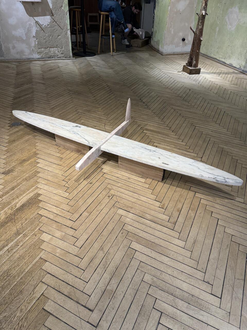 Engraving simple yet eloquent phrases was a method he employed in several works exhibited at his solo show, Forever Today, at The Naked Room in 2024, which was dedicated to his own vision of memorial sculptural language for the near future. There, next to mid-size objects like a plane, pyramid, and obelisk, he hung several heavy plates made of sandstone, marble, and travertine. On each of them, we see the inscriptions like: