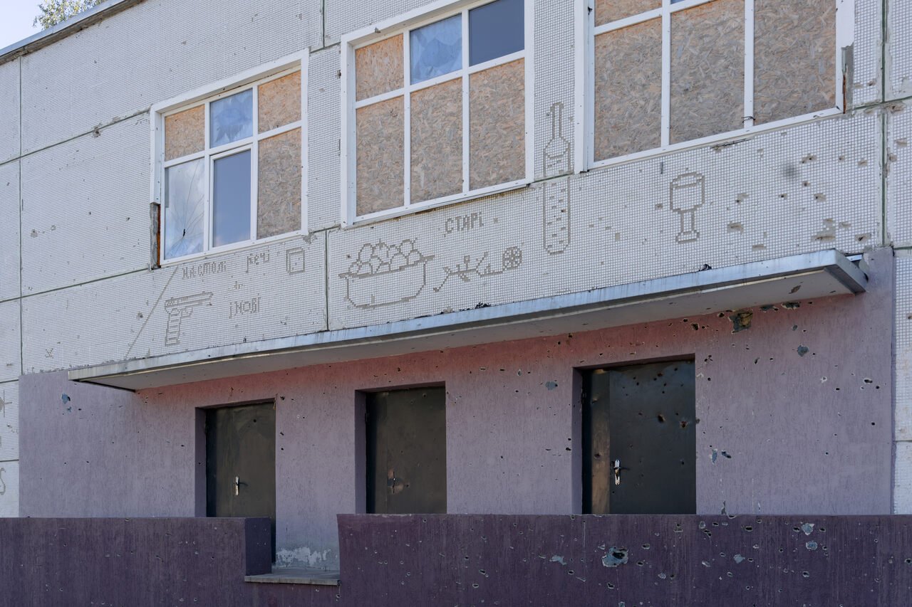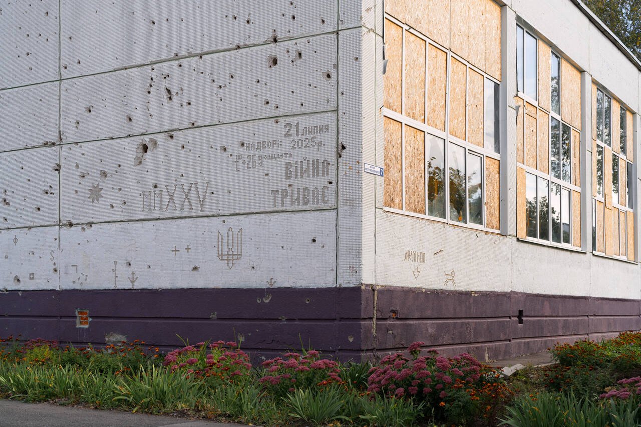 Memory and trauma work in a tricky way. In the cities in the rear like Kyiv, recollections of the first months of the initial russian offensive in 2022 are now partly faded by the seemingly normal everyday life of the megalopolis, and even regular nightly shelling no longer cancels the flow of daytime life. There’s no need to remind the locals of Northern Saltivka that the war goes on – they literally live in its gargantuan traces. The area is about 30 kilometres from the russian border. In 2022, the defence line passed through some of the neighbourhoods, and the russian troops were as close as two kilometres from the school chosen by Kokhan as the spot for his work. Not a single building in the area remained undamaged; some are still inhabited and eligible for reconstruction while others have been demolished or are slated for it.