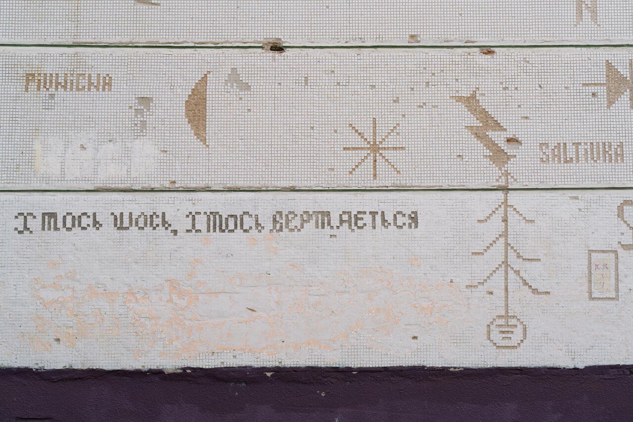 After visiting Northern Saltivka in 2024, following the program, he thought about inscribing text-based messages on the facades of different buildings and creating a route through the neighbourhood. Later in 2025, the artist, in dialogue with Past/Future/Art’s curator and commissioner of the final piece, Kateryna Semenyuk, chose a single site for the final piece – school №165, with its walls left solid but wounded by shrapnel. Originally covered with small, square, white tiles, many of them had fallen off during explosions, revealing the bare concrete underneath. Kokhan took over this existing “ornament” created by the holes and used it as a technique itself – by cutting out even more tiles, he created a sequence of simple drawings and texts that referred to the local experience. Phrases like “The war goes on”, “This wall is a witness of horrors from 24 February 2022”, “Someone whatever, someone came back” or “Mordor — 35 km”[3], as well as simplistic images of a car, a cat, a trident, etc. illustrate the everyday reality of the area in a manner that feels casual, as if the works were created by an anonymous street artist. The inscriptions are a mash-up of past events and are indicators of the artist’s own presence there and then, working on the mural in the summer of 2025.