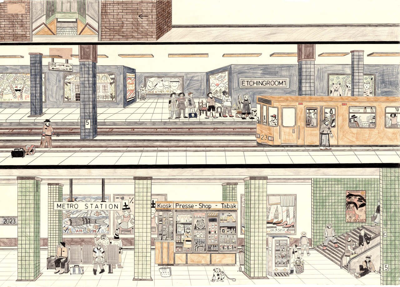 Etchingroom1 is an artistic duo founded in 2016 by artists Kristina Yarosh and Anna Khodkova in Kyiv. Their practice is best known for etching and mosaic work, capturing everyday life of the city with a touch of humour and self-irony. With fellow vampires, swimmers, cosmonauts, and other inhabitants of European urban centers, the artists narrate their experience of today, in its fragility and ambiguity. Currently, they work from Berlin when they’re not on the move.