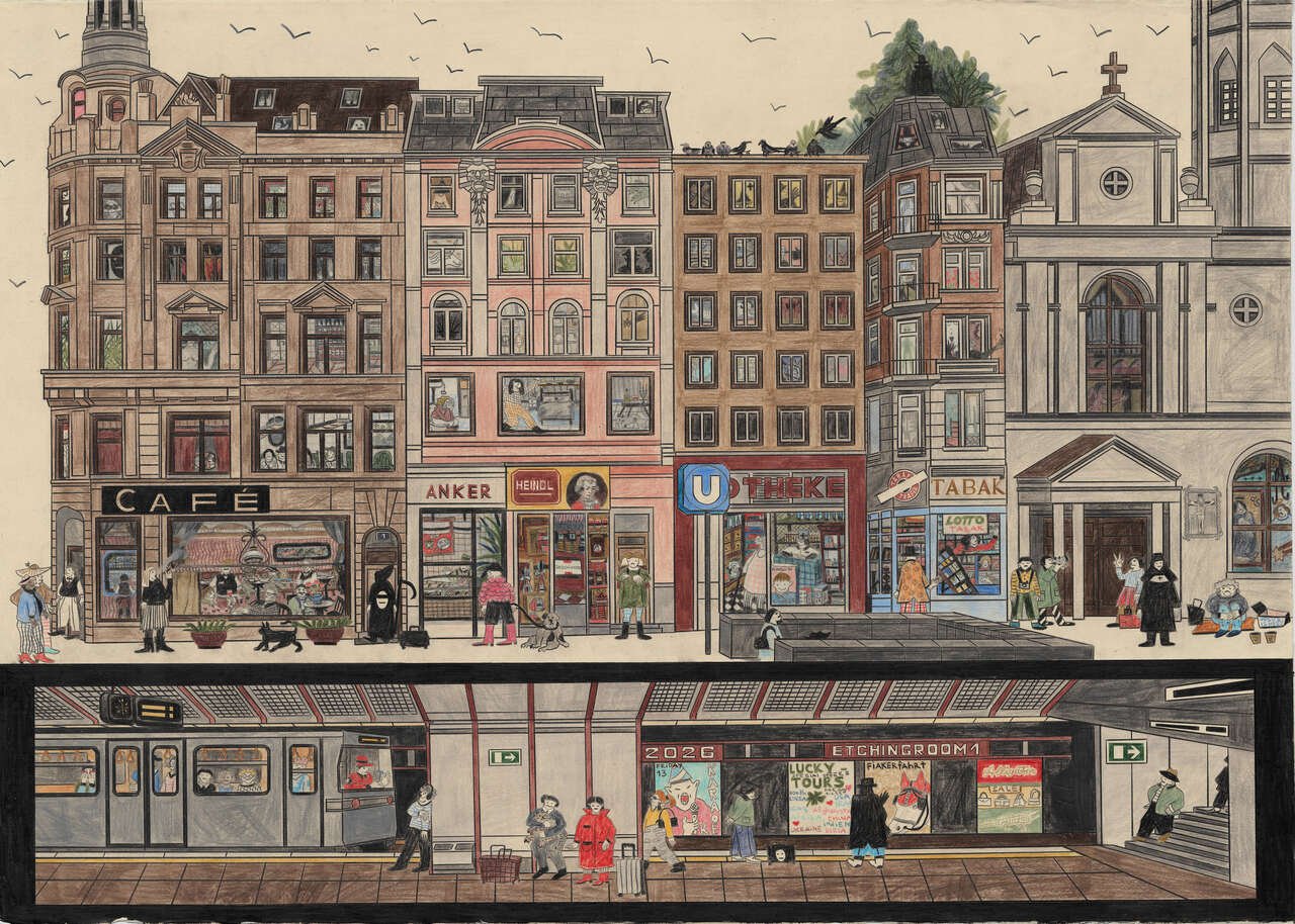 KY: This series is a portrait of the city, usually focusing on a single street. You see it from above, with people going about their lives. We often include a subway, giving an immediate cross-section of the city and its rhythms.