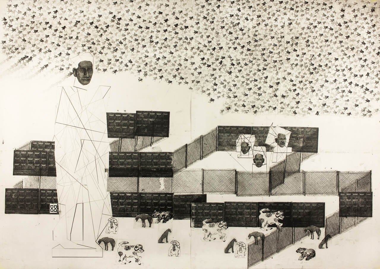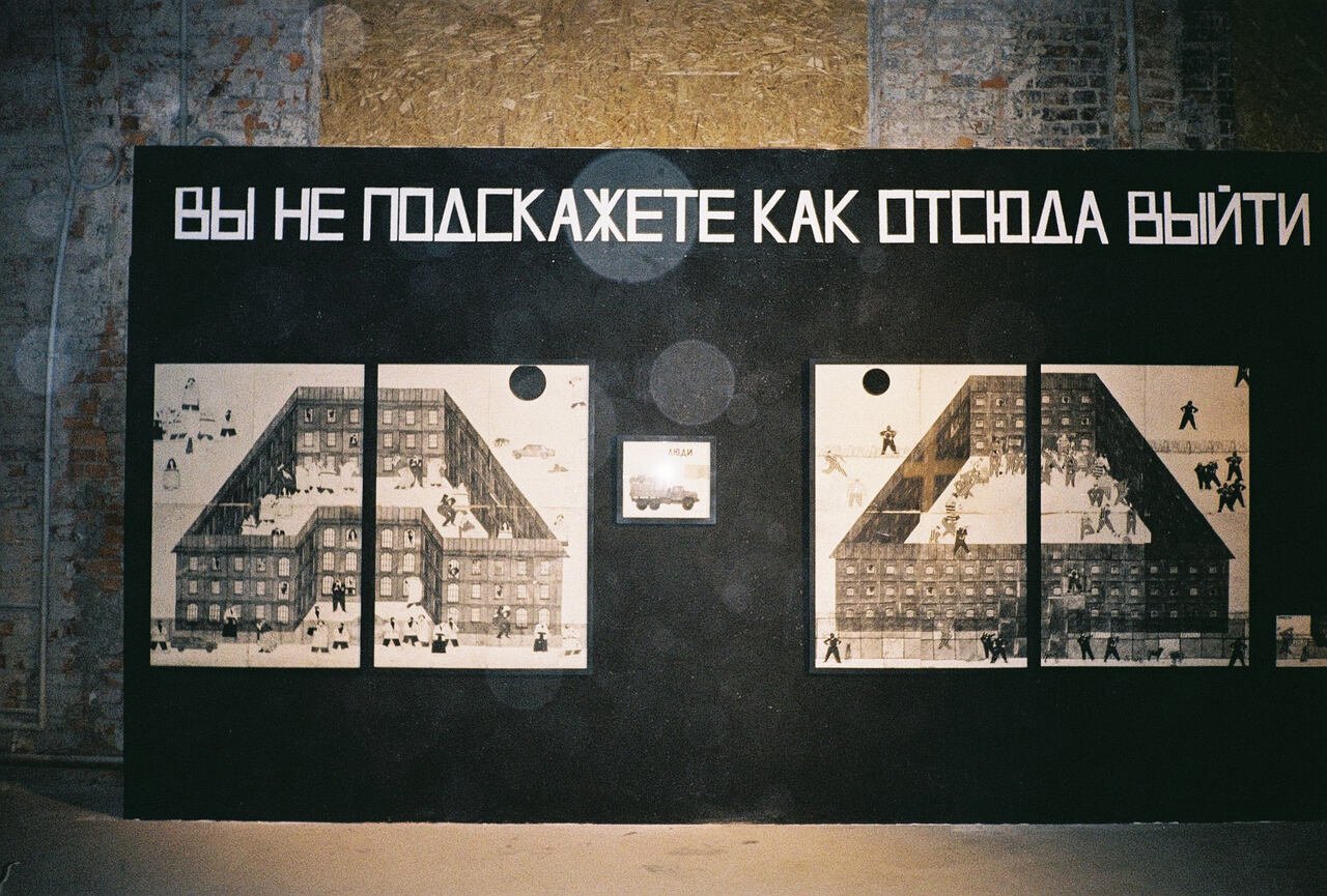 KY: It was common that we took something from life, made a drawing out of it, and then wanted to bring it back into physical form once again. One of such examples is an installation that resembled a bus stop that seemed to emerge directly from the original work. The exhibition featured works about the post-Soviet city and its inhabitants. The works were printed using etching and drawn in a childlike manner with felt-tip pens. There were many themes about death, suicide, and the indifference of people around them to what was happening. The bus stop was built like a corner that leads you into this imaginary city.