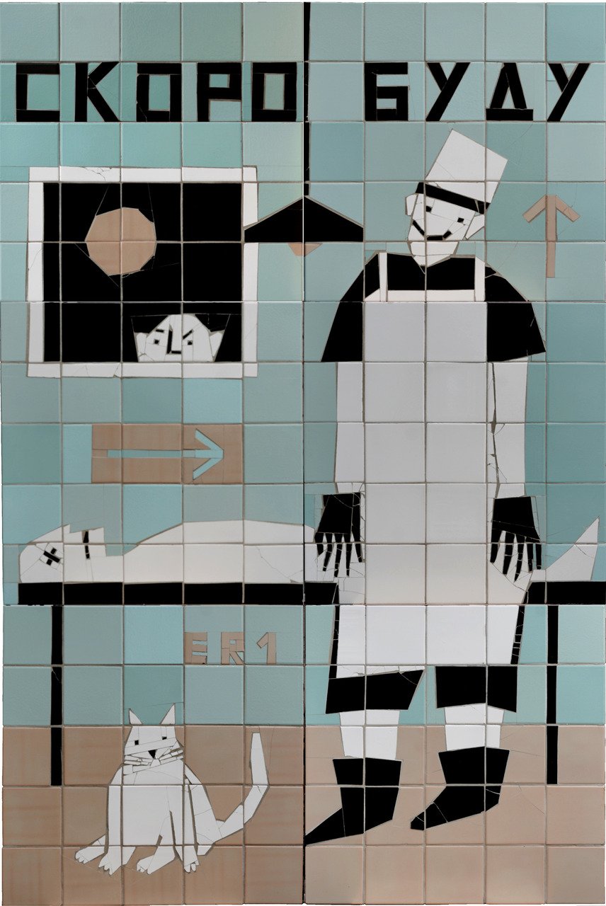 KY: Between 2018–2019, we started making large-format etchings. We really wanted to add color and also to make a larger-format work. And then the idea of mosaics came up, starting with a work measuring 3×2 meters – it kind of happened by accident. We used old tiles.