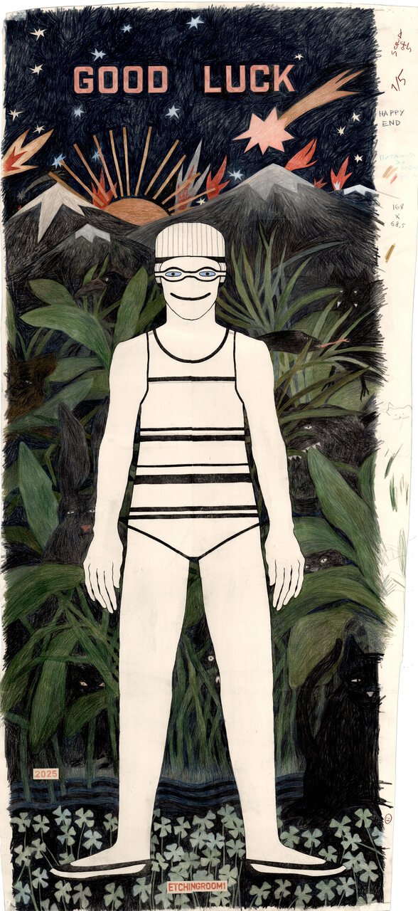 YU: I recently had a chat with a friend about dynamics that emerge in creative processes – be it the film director/actor relationship, choreographer/dancer, writer/editor, and so on. I was curious to ask you about fictional characters. Take the swimmer, for instance – who was the main inspiration for this conversation, and who has been consistently appearing in your etchings since 2018. It’s almost as if some of your characters become your collaborators who appear in different contexts and stories. What are your thoughts on this?
