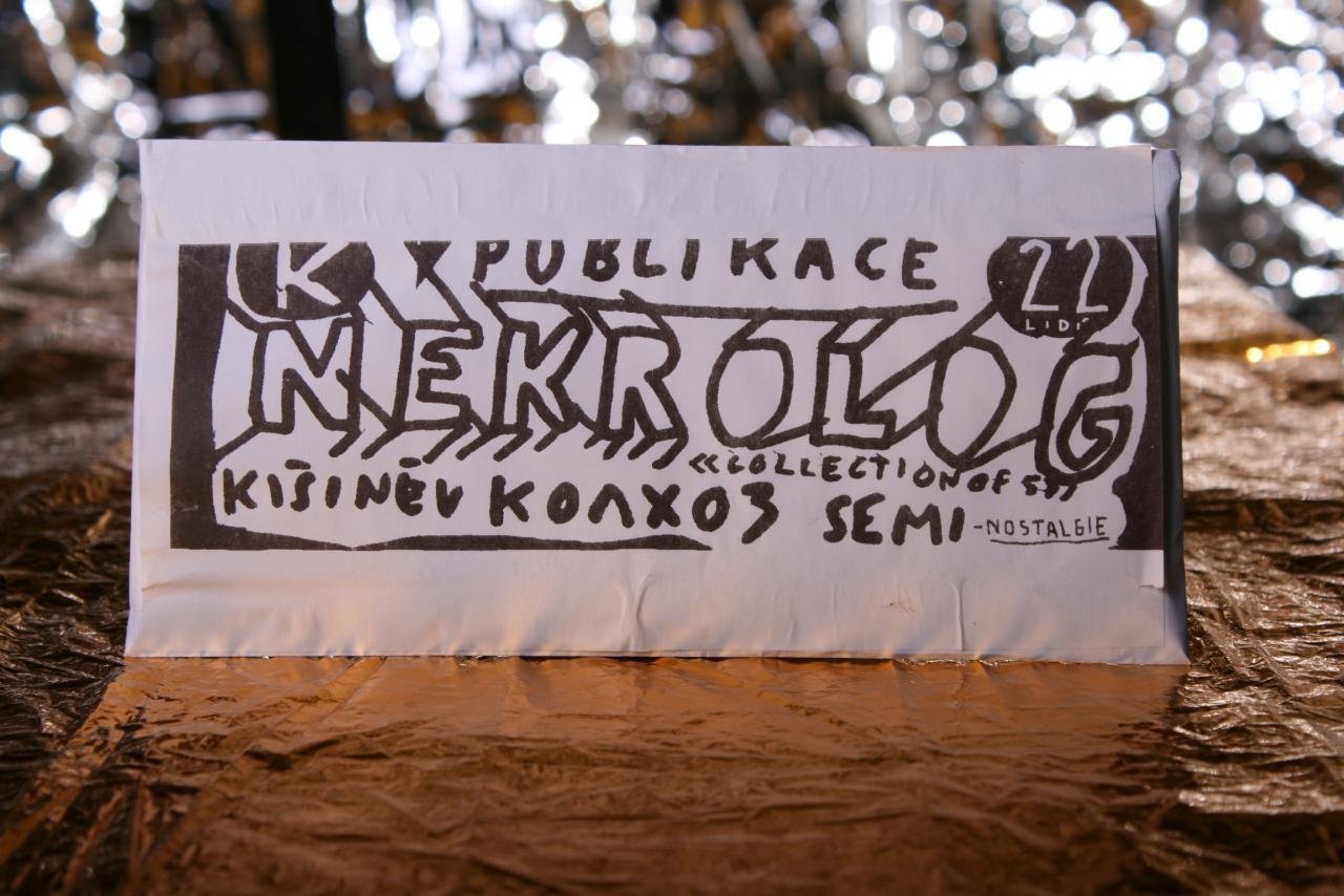Kolxoz Collective x Young Artists Association “Oberliht”, “SBORNÍK NEKROLOGŮ” zine cover in the form of a postal envelope, 2020, thermal printing on fax machine, produced in frame of “Edu-Art: Periphery” educational course at 3rd Space Studio (Chișinău). From the archive of 3rd Space Studio (Chișinău). Image courtesy of 3rd Space Studio.