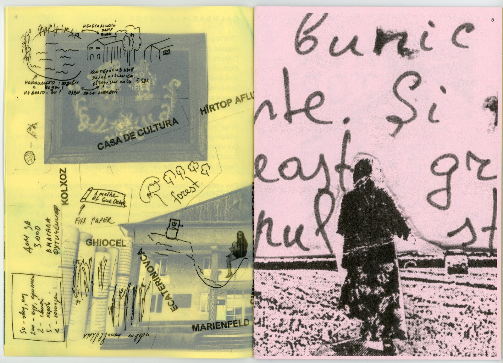 Kolxoz Collective, “Quasi-Book” page spread, 2021, laser printing on found paper. From the archive of 3rd Space Studio (Chișinău). Image courtesy of 3rd Space Studio.