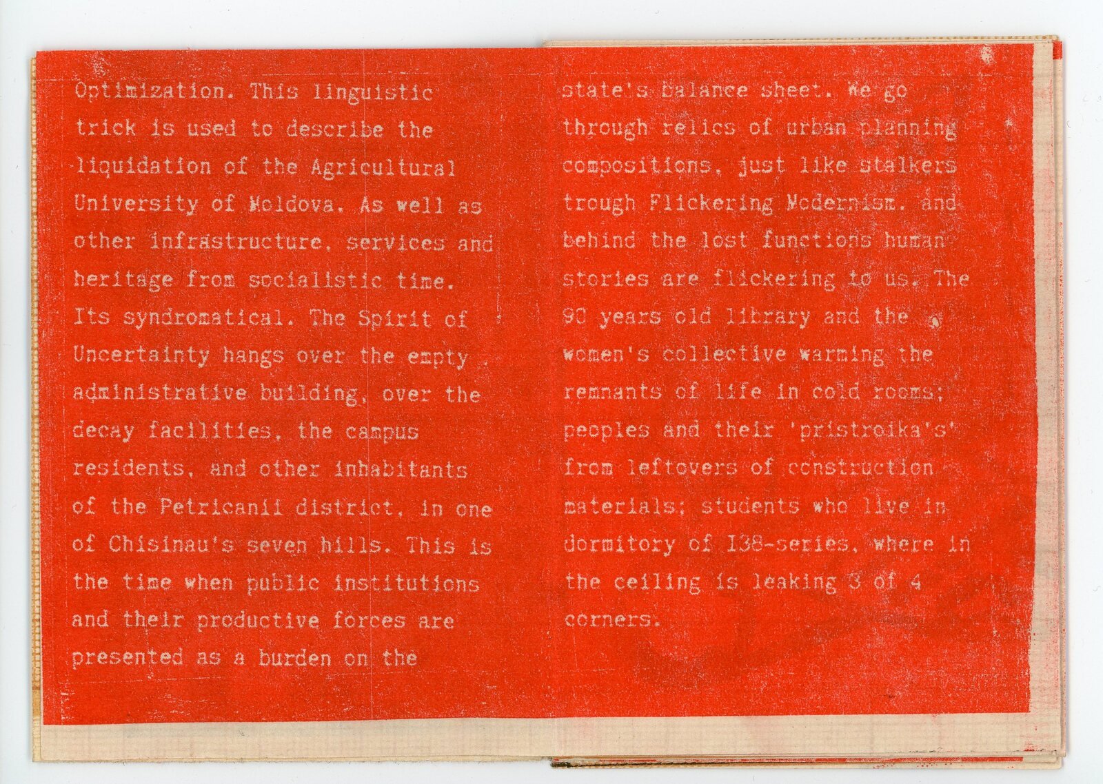 The title of this collective zine repeats the spell that circulated around the process of disappearance of such institutions as the Agricultural University of Moldova – a landmark educational center, given the country’s economic specifics. The edition of thirty copies was printed on architectural graph paper, a reference both to the modernist planned organization of urban space and the city walk Relics of Urban Planning Compositions. This walk took place on the first day of the experimental small-scale publishing laboratory “From the hill to the valley,” which took place in the 3rd Space Studio within the framework of the SCA2025 program organized by the Oberliht Association. There was a field trip, which consisted of an artistic exploration of Petricani Hill, one of the microdistricts of Chișinău that was built during the socialist period, famous for its former agricultural institute. One of the purposes of the walk was to visually observe how, under this slogan of necessity, infrastructural and institutional degradation is taking place.