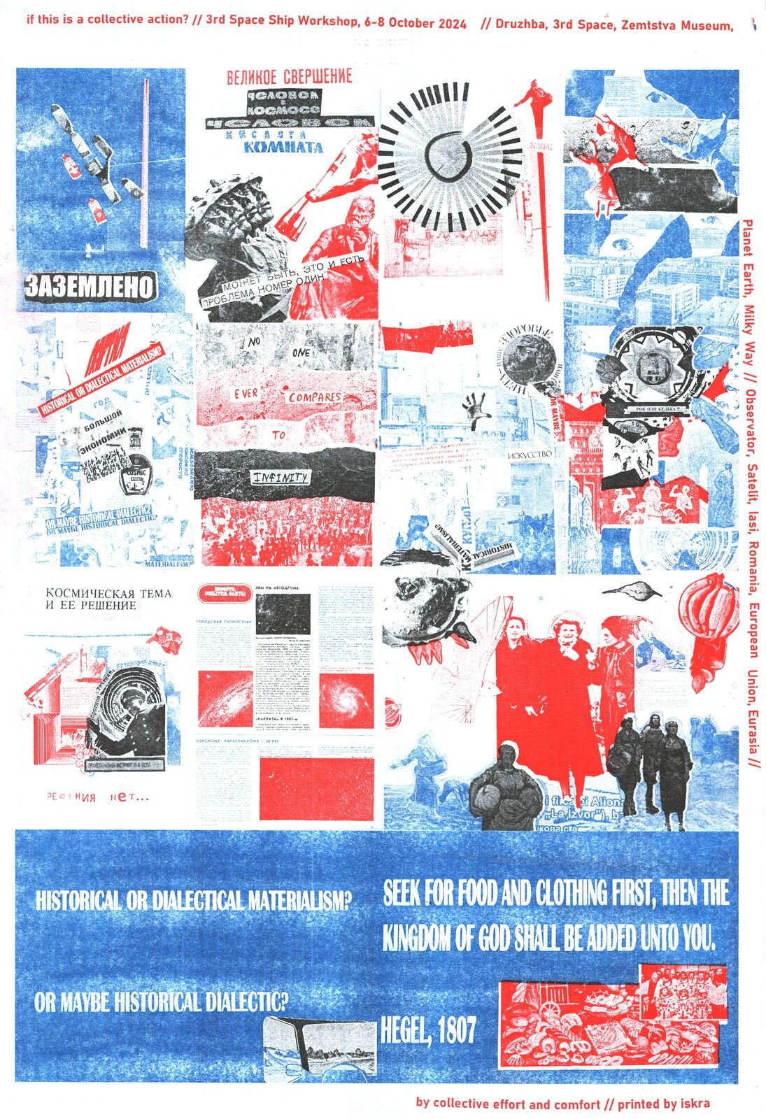 Satelit Association x Drujba Collective, “IF THIS A COLLECTIVE ACTION?” zine cover, 2024, riso print, produced during the workshop “3rd Space Shipheld in the frame of “Observator project” (Iași). From the archive of 3rd Space Studio (Chișinău). Image courtesy of 3rd Space Studio.