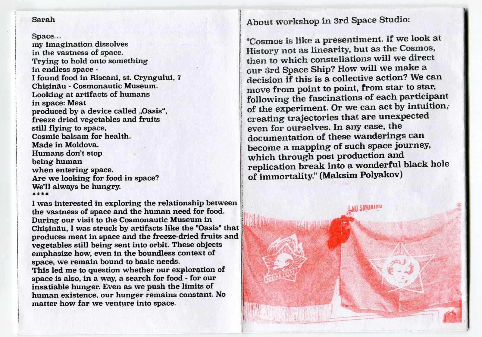 To work with these issues and challenge linear notions, the group turned to collective reading of Walter Benjamin’s essay “Theses on the Philosophy of History.” Through this practice, the group became equipped for an excursion to the Yuri Gagarin Cosmonautics Museum – an amateur museum at the Young Technicians Station in Chișinău. Observations and visual materials obtained there formed the basis of the zine.