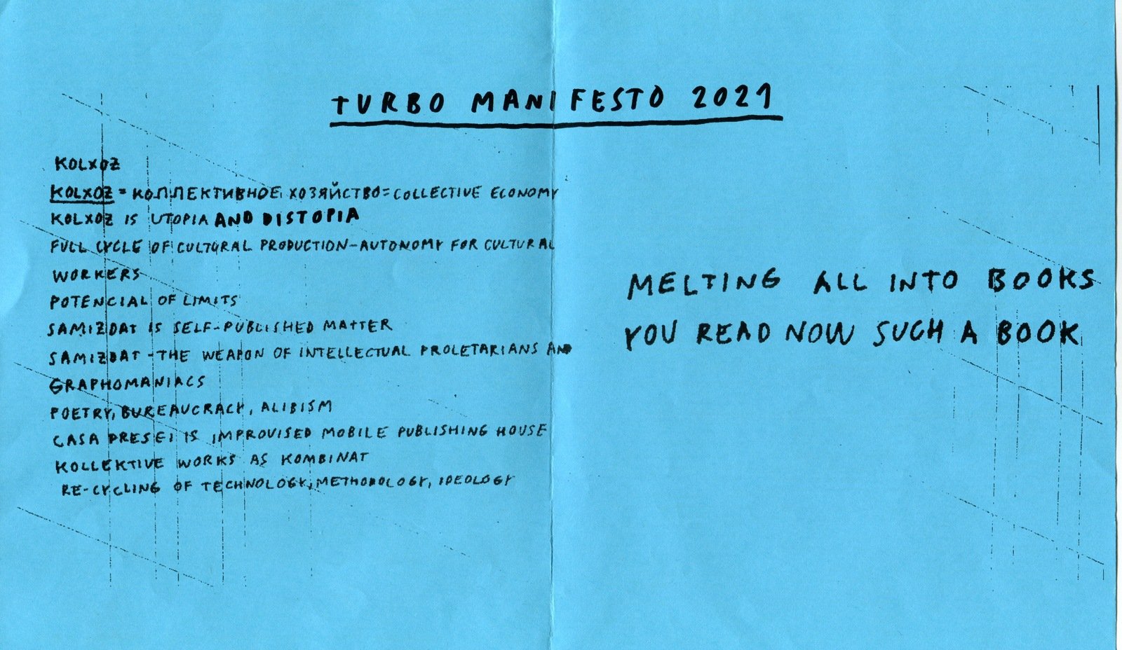 So, let’s return to what I briefly touched on above: if you doubt the unfounded aestheticization that leads to the fetishization of a product, questions of function arise. I mentioned printed matter as a means of communication. The next question then becomes: if it is a means of communication, then with whom? If you’re not targeting a mass market, you have to figure out who specifically you’re addressing. First of all, it should feed the internal needs of the collective. In the process of formulating and producing such supporting documents, printed objects with self-descriptive, self-reflective, and statutory functions, a process of synchronization occurs. If we don’t synchronize, we’re just wasting time. This allows us to establish certain starting points, as well as a primary navigation and coordinate systems for the collective, which also helps to understand what to strive for. This knowledge has a constitutive role, for samizdat allows us to remind ourselves what to appeal to in the event of disputes and emerging contradictions.