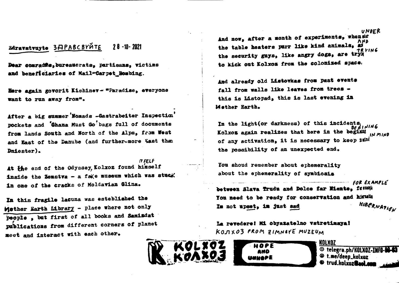 The next important function that samizdat plays in the 3rd Space Studio can be described by one word: “signals.” This is, first of all, communication that is addressed externally. It aims to find like-minded enthusiasts or potential collaborators, or just new friends. Those who are ready and able to read the signal. The function of signals is realised by such printed matter as letters, listovka (leaflets), instructions, postcards, and reverse open-calls for organisations ( the idea is that artists are choosing institutions, not vice versa, as it usually is). Distrusting the uncontrolled algorithms of social networks and their methods of representation (which lead to consumer automatism of such services from monopolizing corporations), the studio welcomes alternative distribution methods, such as “human post,” where information is distributed from hand to hand, relying mostly on acts of human interaction.