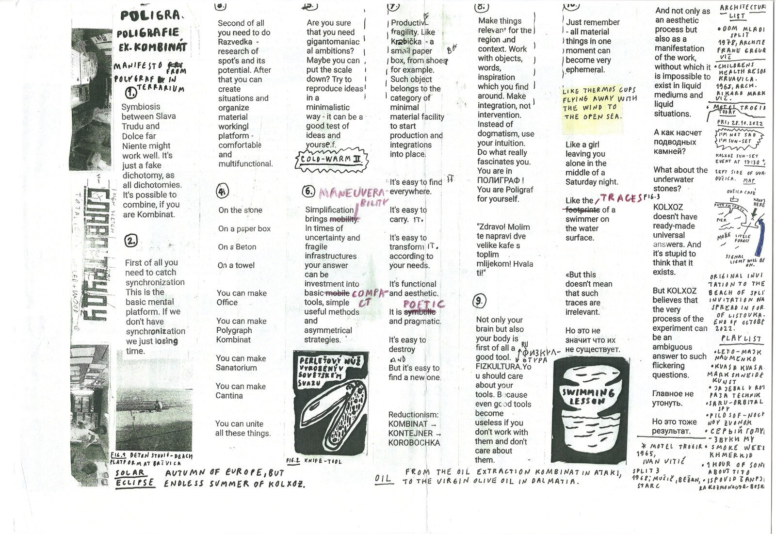 These practices match perfectly and share a sensibility with the practices of Mexican conceptual artist and publisher, Ulises Carrión, the person who broadened the idea of what a book can be. ”When an artist is busy choosing his starting point, defining the limits of his scope, he has the right to include the organization and distribution of his work as an element of the same work. And by doing so, he’s creating a strategy that will become a constituent “formal” element of the final work.”4 We were interested in continuing this tradition, which called for practical viability testing. Equipped with experience developed in the process of running 3rd Space Studio, the Kolxoz Collective started to create and print samizdat in various environments. It often happens in field conditions: on the tables of a gas station cafe, at flea markets or public beaches. In these new situations, in new countries or continents where the collective happens to find themselves, the working methods of samizdat are sharpened, refined, adapted to the momentary needs and are recorded through the practice of samizdat itself. This can be illustrated by an example from the concrete beach of the Croatian city of Split, where we managed to compress huge polygraph kombinat (printed matter factory) into a cardboard shoe box or even a pocket, the goal was to retain the function of printing a gazetka (small newspaper). Ambitious, somewhere deliberately speculative like a promise to oneself, but often coming from pragmatic needs, such experiments recycle methods and ideas known from underground cultural practices developed in Socialist Bloc countries. What back then was developed as a response to the need for creating and sharing ideas that didn’t fit into ideologically driven official culture is now transformed into tools helping small mobile collectives to function in contemporary cultural frameworks, leaving material traces of communication with colleagues and friends any place they feel they need to do it.