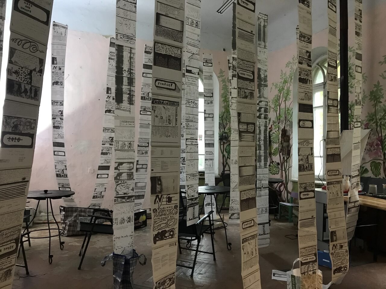The presentation took place in cafe-buffet “Orbita.” Sitting at the tables of this makeshift cafe, visitors could satisfy their basic needs while simultaneously touching the contents of the zines, which flowed from the ceiling to the floor like paper waterfalls. This book launch event was called Up to Ground, Down to Cosmos. Semi-nostalgia, almost-melancholia. Autumn Necrologue Salon and, as a process of the creation of the publication, took place as part of the “Edu-Art” course — an informal program of art education organized by the Moldovan Young Artists Association “Oberliht”. The course’s theme was the periphery, so the zine’s character seemed relevant not only to the geographical and socio-political aspects, but also to the human life scale, even acquiring a certain metaphysical connotation.