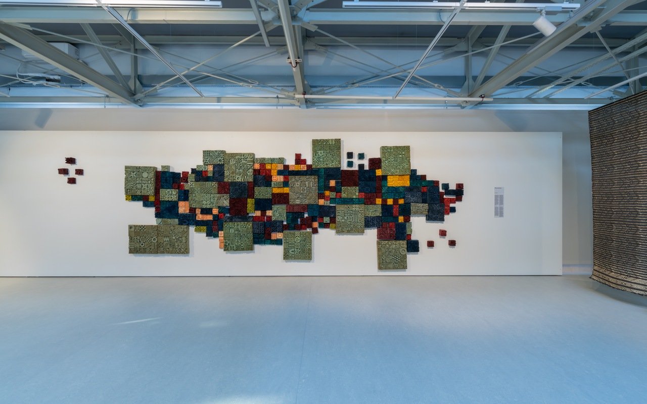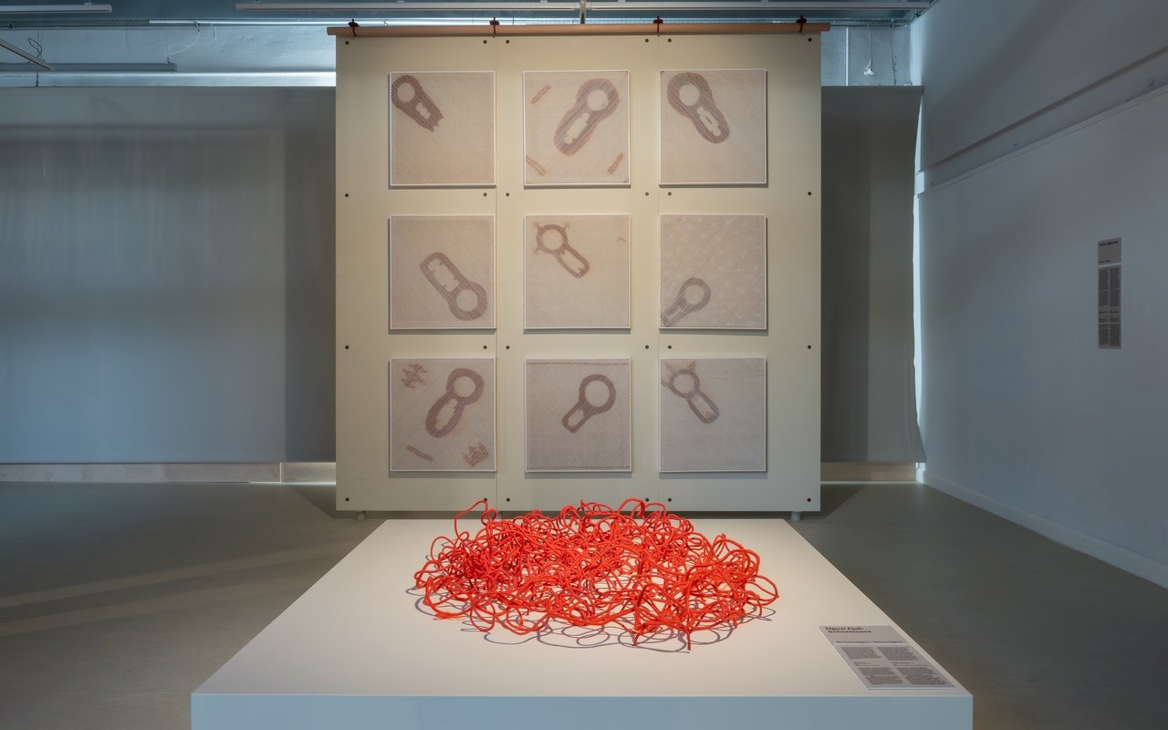 Rhizomatic Portals: Ways of Knowing is presented in a challenging space on the third floor with prominent structural angles, cold glass and steel architecture, and clear visibility to the lower floors where the main exhibition, Deconstruction/Reconstruction, is presented. There was not much guidance for how to move within the exhibition; instead, it unfolded as a quiet choir of various artistic voices. Oyebode-Westerhuis explains that the exhibition draws on Gilles Deleuze and Félix Guattari’s notion of the rhizome, as well as African feminist ideas by Ifi Amadiume, Patricia McFadden, and Minna Salami. The works span across generations and geographies, tracing personal histories, dreams, myths, cultural practices, transnational identities, and the labor of women. The works – by Amina Agueznay (Morocco), Peju Layiwola (Nigeria/USA), Aissa Dione (Senegal), Marie-Claire Messouma Manlanbien (France/Ivory Coast), Ngozi Ajah Schommers (Nigeria/Germany), Adeola Olagunju (Nigeria/USA), Sondos Shuaib (Sudan/Italy), weavers from Ghana’s Upper West region, and the archive materials and catalogue of Madame Zo (Zoarinivo Razakaratrimo, Madagascar) – do not submit to easy reading, nor to the external gaze. They occupy their own space. They resonate quietly, self-sufficiently, like a pantheon of goddesses, each bearing distinct gifts, histories, and rhythms. Together, they create new landscapes and realms: intellectual, emotional, and aesthetic, shaped as much by themselves as by those who enter.