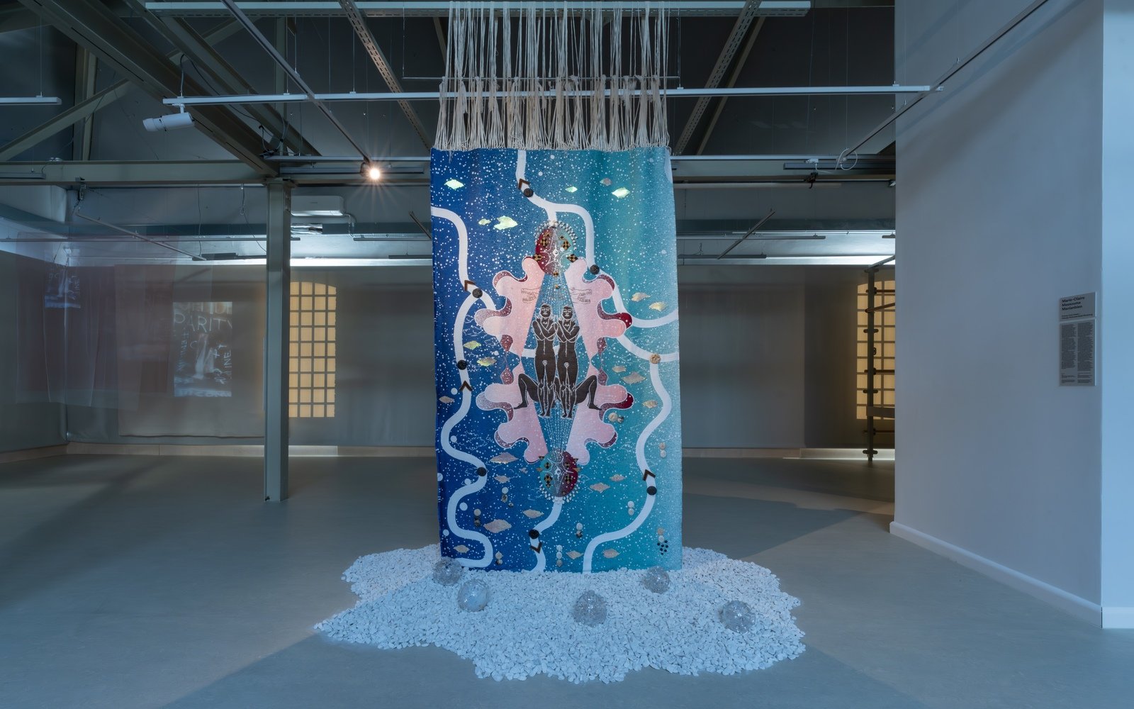 Some works felt like they were clashing, especially the work of Marie-Claire Messouma Manlabien, working between the Ivory Coast and France, and Georgian artist Gvantsa Jishkariani, whose work hung suspended between the floors. Jishkariani’s work – a series of embroidered tapestries called Brutal Honesty – is somehow brutal: ripped vintage materials, threads hanging loose, colors similar to blood, mud, and cold steel. It was also far away from the viewer in space; you could read phrases like “generational trauma” or “history of shame” but you could not touch them. Manlabien’s Take Care, on the other hand, sits at your fingertips. A large-scale object combining fabric with pebbles, glass, and subtle sound, glowed in soft lilac, pink, and pale blue tones. Its presence was calm, luminous, and meditative, a perfect example of the artist’s approach: modular, responsive, and attentive to the rhythms of space. In contrast to Jishkariani’s taut, politically charged tapestries, Take Care offered a spatial and emotional counterpoint: poetic, gentle, and luminous, yet still a part of the same constellation of feminine experience, encompassing the soft and the brutal, the light and the dark, the beautiful and the painful. It is mesmerising with all its stories, possibilities, and complexity, of what the feminine (or spiritual human) experience embodies in our physical world, with all its glitter and blood and unexpected affairs. We are involved in stories and collective relationships that we may not yet be aware of – and telling a story through objects enables us to rework history, trauma, and to reconstruct the world as we want it.5