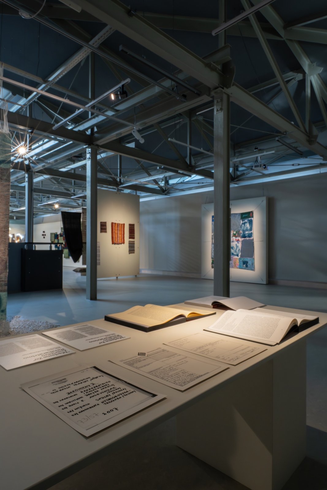 The first work I engaged with is not an obvious one: it was a small presentation of documents, books, and photographs. Homage to “Madame Zo” Zoarinivo Razakaratrimo put together with the help of Hobisoa Raininoro, Tony Agbapuonwu, and the CMWL (Central Textile Museum in Łódź) Library and Archive seemed to be a primary source for this exhibition. The survey of works and the memory preserved through Madame Zo’s catalogue becomes a presence that quietly radiates through every corner. In that presentation one can see her monumental weavings born of ancestral Malagasy forms, her self-made looms, and her original experimentation with materials. They beckoned to me; I could feel them beaming. It was a very lively archive: her work emanates outward, seeping onto the pieces of other artists, recalling the paths she had paved for them many years earlier, as a pioneer in her field. Working primarily in textiles and three-dimensional hanging forms, often combining organic and inorganic materials, Madame Zo (1956-2020) situated her practice at the intersection of traditional Malagasy weaving, experimental materiality, and socio-political reflection. In the space of Rhizomatic Portals(…), this artist from Madagascar is not only history or reference, she seems like a force or a guiding presence whose voice hums beneath everything.