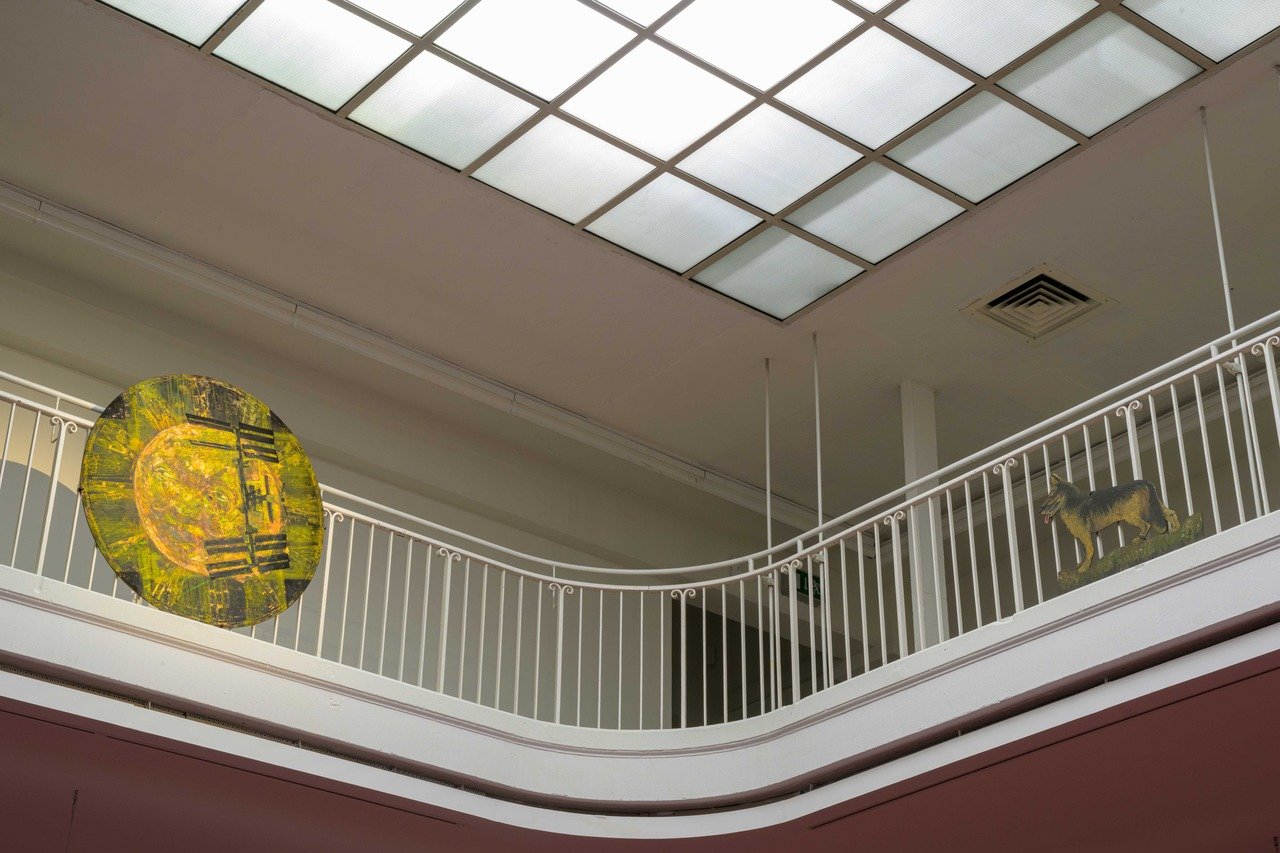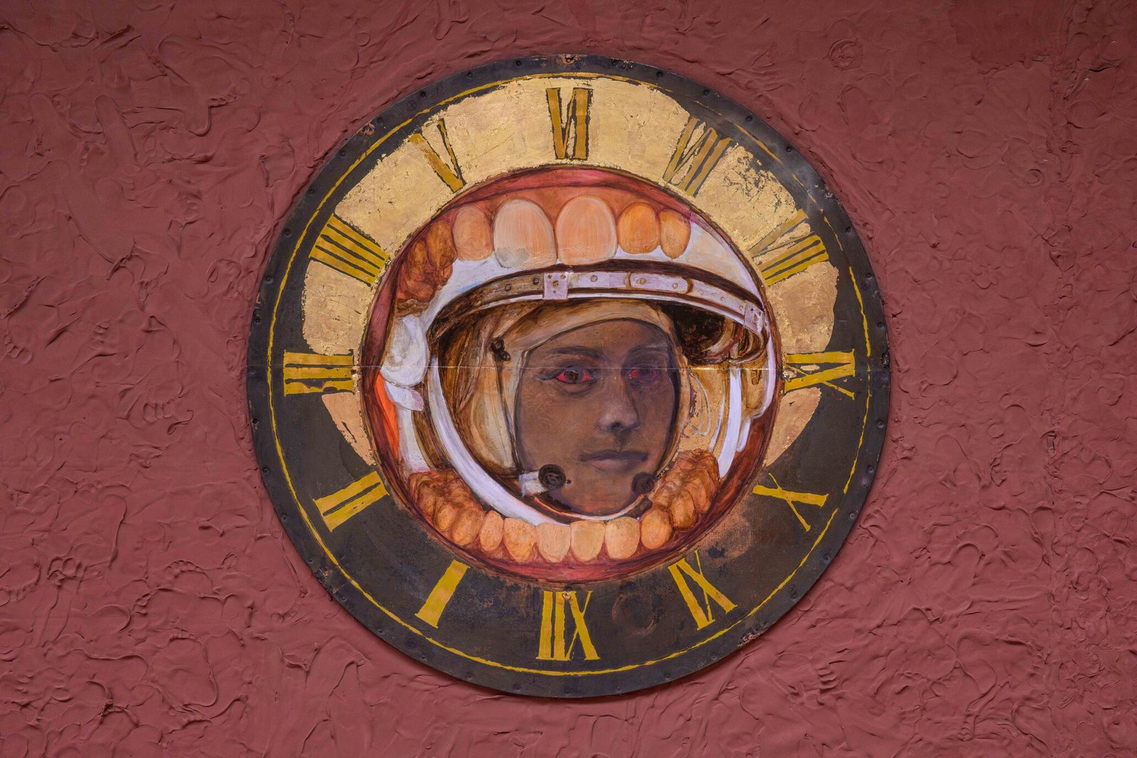 The series of ten paintings on clock faces brought together in Rubigo were produced between 2022 and 2026, an unusually condensed period for Kovalčíková, who often spends several years working and reworking each painting. Yet, with their worn enamel surfaces and rust, the image supports themselves carry the sedimentation of time. The artist thus foregrounds transience and the materiality of time over its abstract symbols and representations. The compositions she paints and collages onto the circular planes further unsettle the clock’s linear, measurable time; instead, time appears layered and folded in on itself. As the title Timeshifters (2026) suggests, Kovalčíková’s paintings and their protagonists seem able to travel through or slip between different periods and notions of time.