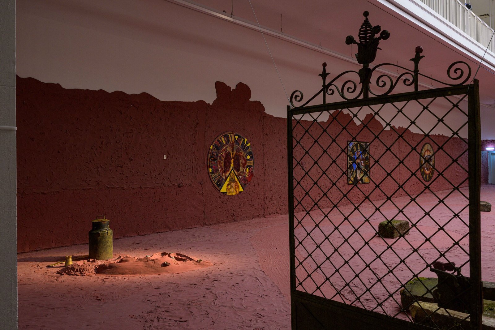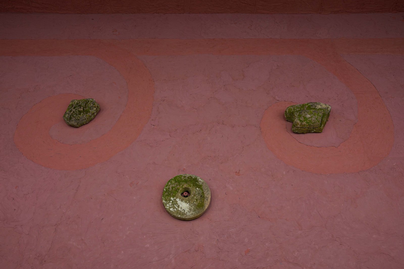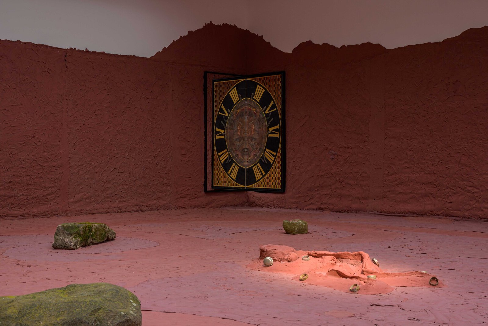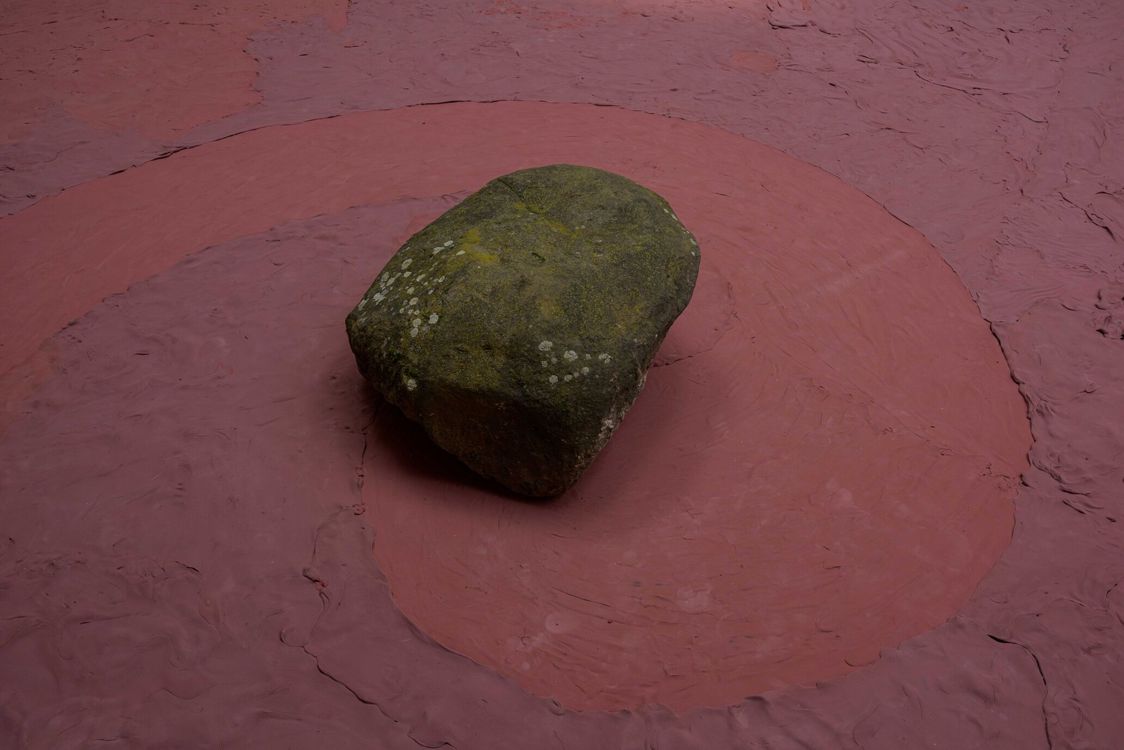 Viewed from above, the paths running across the plasticine converge into an ornamental spatial drawing reminiscent of Land Art. Yet unlike Land Art, this is not a violent incision into a “natural” landscape, but the creation of an artificial landscape within an exhibition space. The scattered boulders and stone troughs can serve as seating for viewing the paintings. They are made from the same red sandstone that was used in the construction of Freiburg Münster. Arranged in this way, the stones create an atmosphere that might recall Stonehenge, as if one were moving through a field of archaic markers – relics of rituals whose original meaning has long been lost. The colour of the plasticine not only reflects the red tones of the Münster, but it also evokes iconic red rooms, such as the suffocating interior of Ingmar Bergman’s Cries and Whispers (1972) or the psychedelic set designs in Dario Argento’s Suspiria (1977).