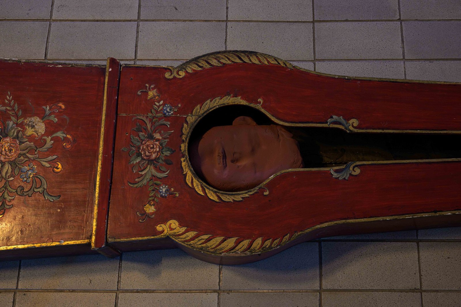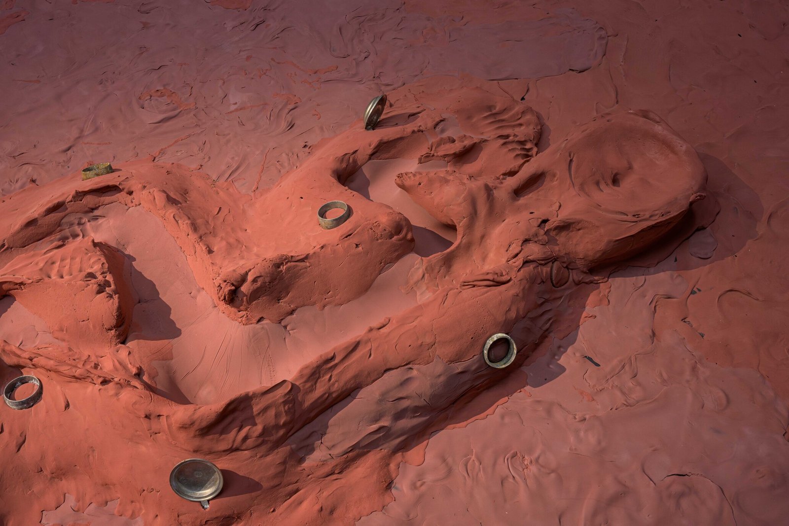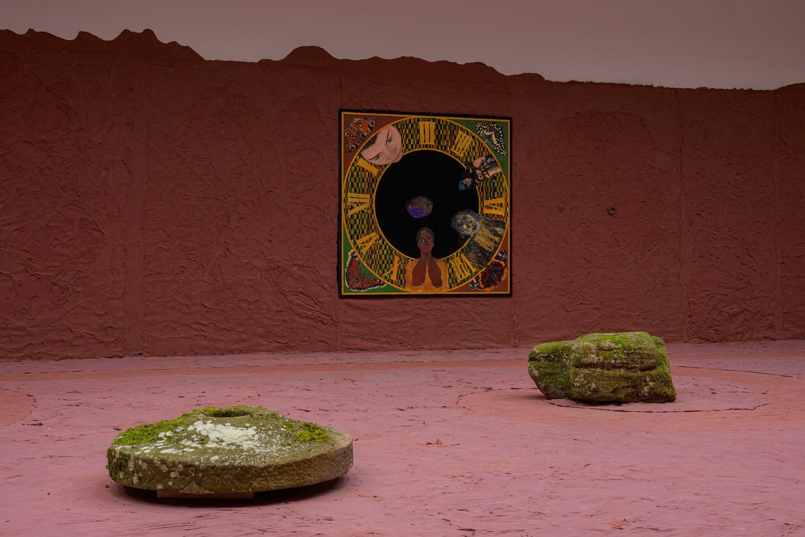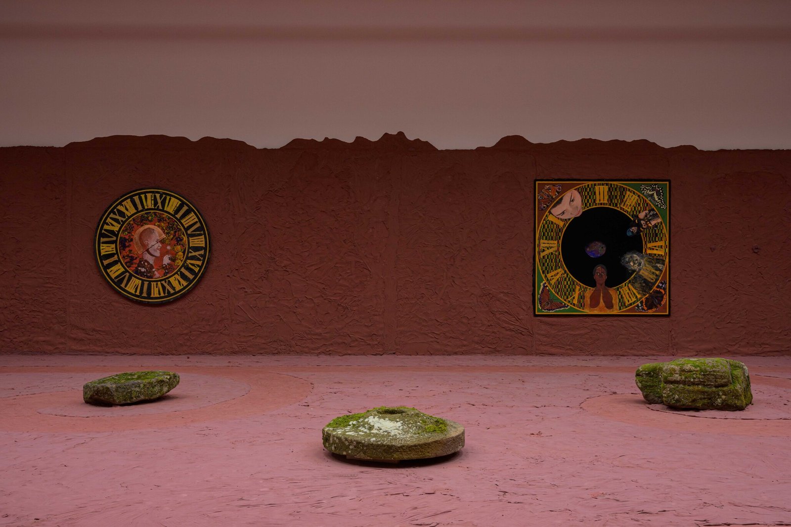 Viewed from above, the paths running across the plasticine converge into an ornamental spatial drawing reminiscent of Land Art. Yet unlike Land Art, this is not a violent incision into a “natural” landscape, but the creation of an artificial landscape within an exhibition space. The scattered boulders and stone troughs can serve as seating for viewing the paintings. They are made from the same red sandstone that was used in the construction of Freiburg Münster. Arranged in this way, the stones create an atmosphere that might recall Stonehenge, as if one were moving through a field of archaic markers – relics of rituals whose original meaning has long been lost. The colour of the plasticine not only reflects the red tones of the Münster, but it also evokes iconic red rooms, such as the suffocating interior of Ingmar Bergman’s Cries and Whispers (1972) or the psychedelic set designs in Dario Argento’s Suspiria (1977).