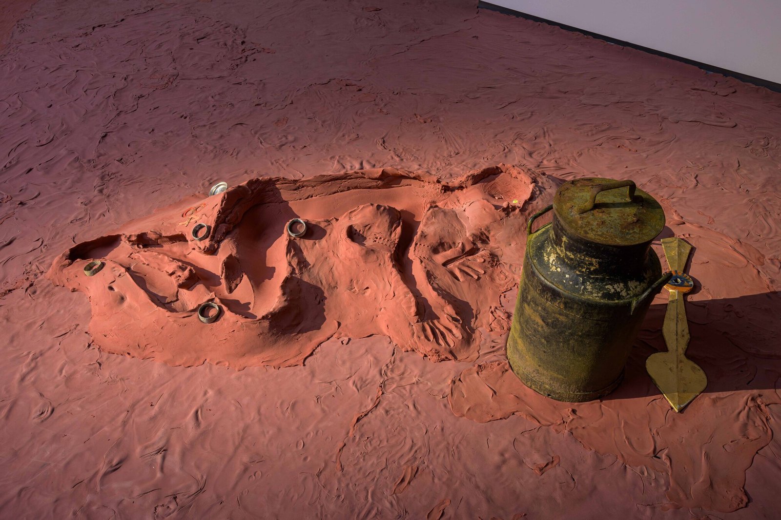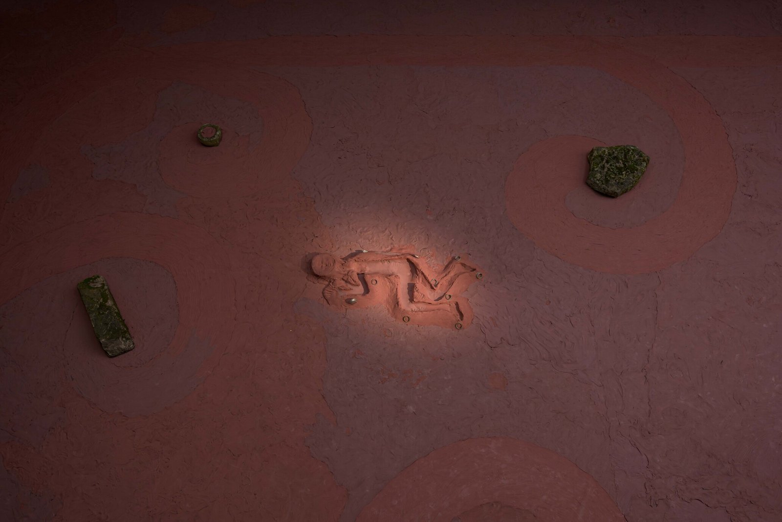 In Rubigo, however, this mothership is not an idealised womb, but a decaying, exhausted body. Once this malleable and endlessly yielding plastic medium dries, it becomes hard and will slowly disintegrate over the course of the exhibition. The plasticine retains the imprint of every step, every instance of pressure, every form it has been given. This material process resonates with philosopher Catherine Malabou’ s conception of plasticity, which she contrasts with elasticity. Whereas elastic, flexible materials can bend and then return to their initial form, plasticity names the ability to receive form while being irreversibly altered.4 Transposed into a political and social realm, Malabou links “elasticity” to neoliberal demands for endless flexibility and adaptability, and the expectation that subjects can be indefinitely put under pressure, depleted and yet return to an original form after rest. By contrast, Kovalčíková’ s hardened plasticine offers an image of material fatigue.
