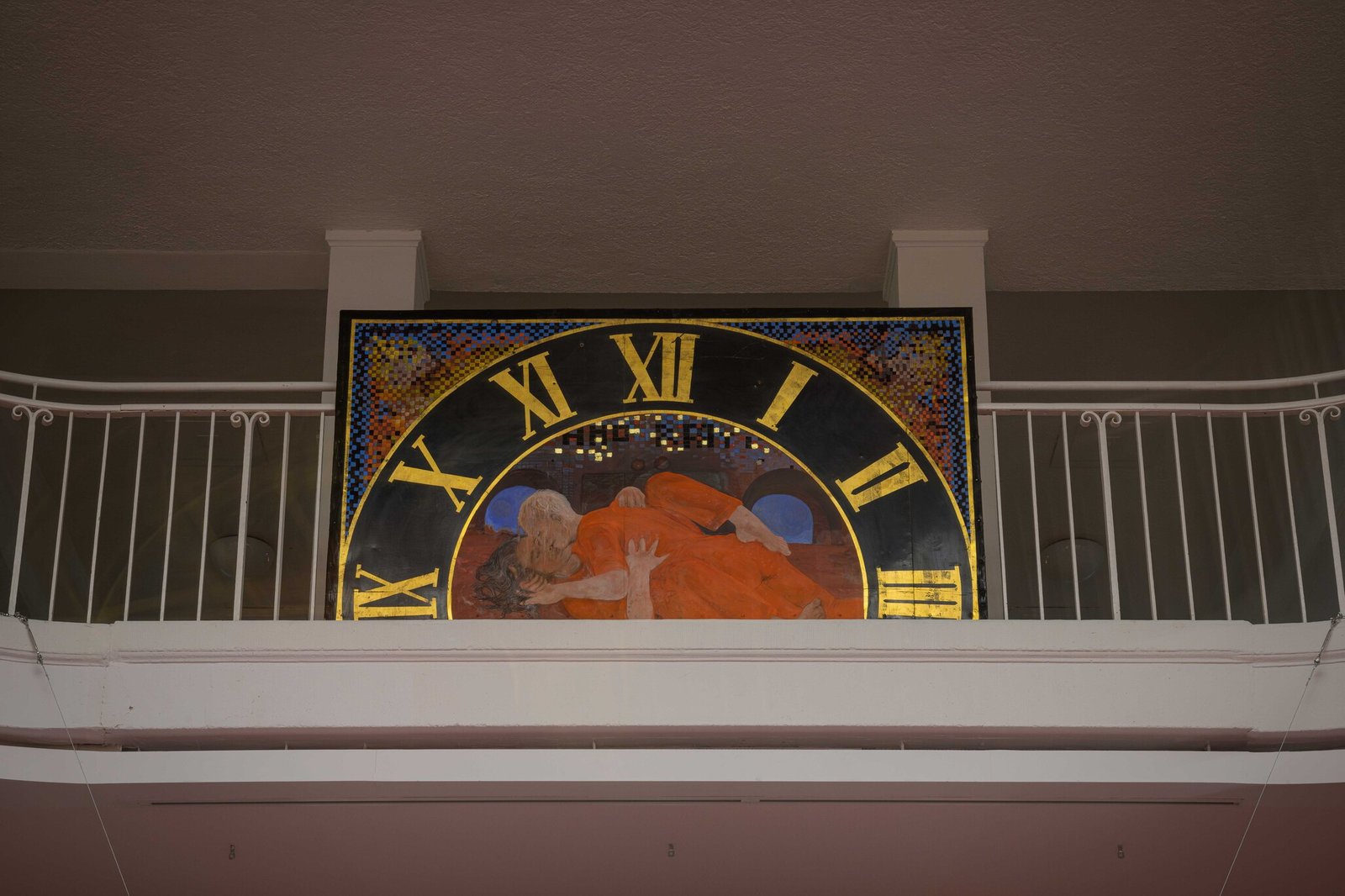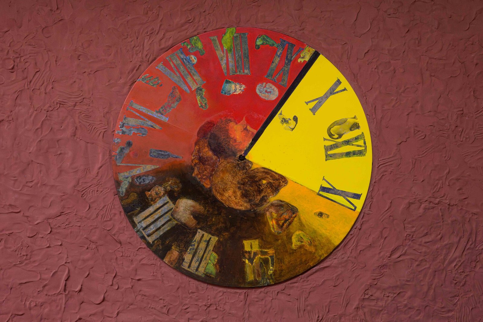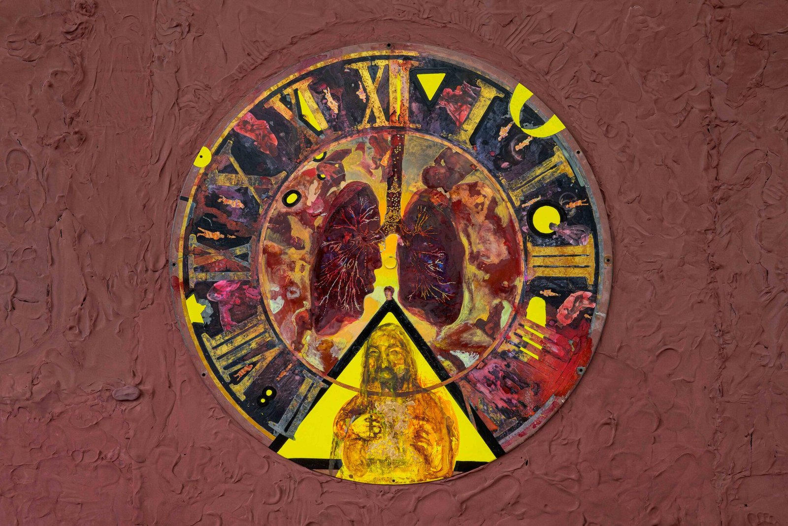 In “On the Concept of History” (1940), Walter Benjamin evokes a scene from the July Revolution of 1830 in Paris, where insurgents were seen firing at the dials of clock towers as if attempting to arrest time itself.5 An eyewitness, relayed by Benjamin, compares the revolutionaries to the biblical figure Joshua, who brought time to a standstill by asking God to stop the movement of the sun. Benjamin understands the act of shooting at clocks – the most ubiquitous and pervasive representation of Western modern time – as an attempt to produce a radical break in the dominant order. The insurgents’ iconoclastic act testifies to the power of timekeeping devices in shaping how time is thought and lived. Representations of time become a political battlefield. In Rubigo, the large clock dials have already been discarded from their once hyper-visible positions on towers and churches. As clock enthusiasts and collectors sought only the mechanics, the clock faces were left behind as nostalgic relics in a secular, contemporary world. Stripped of their hands, they appear strangely silenced and still. Through the artist’ s restorative yet distorting interventions, the Roman numerals are sometimes superimposed, sometimes turned upside down, as if time itself had slipped.